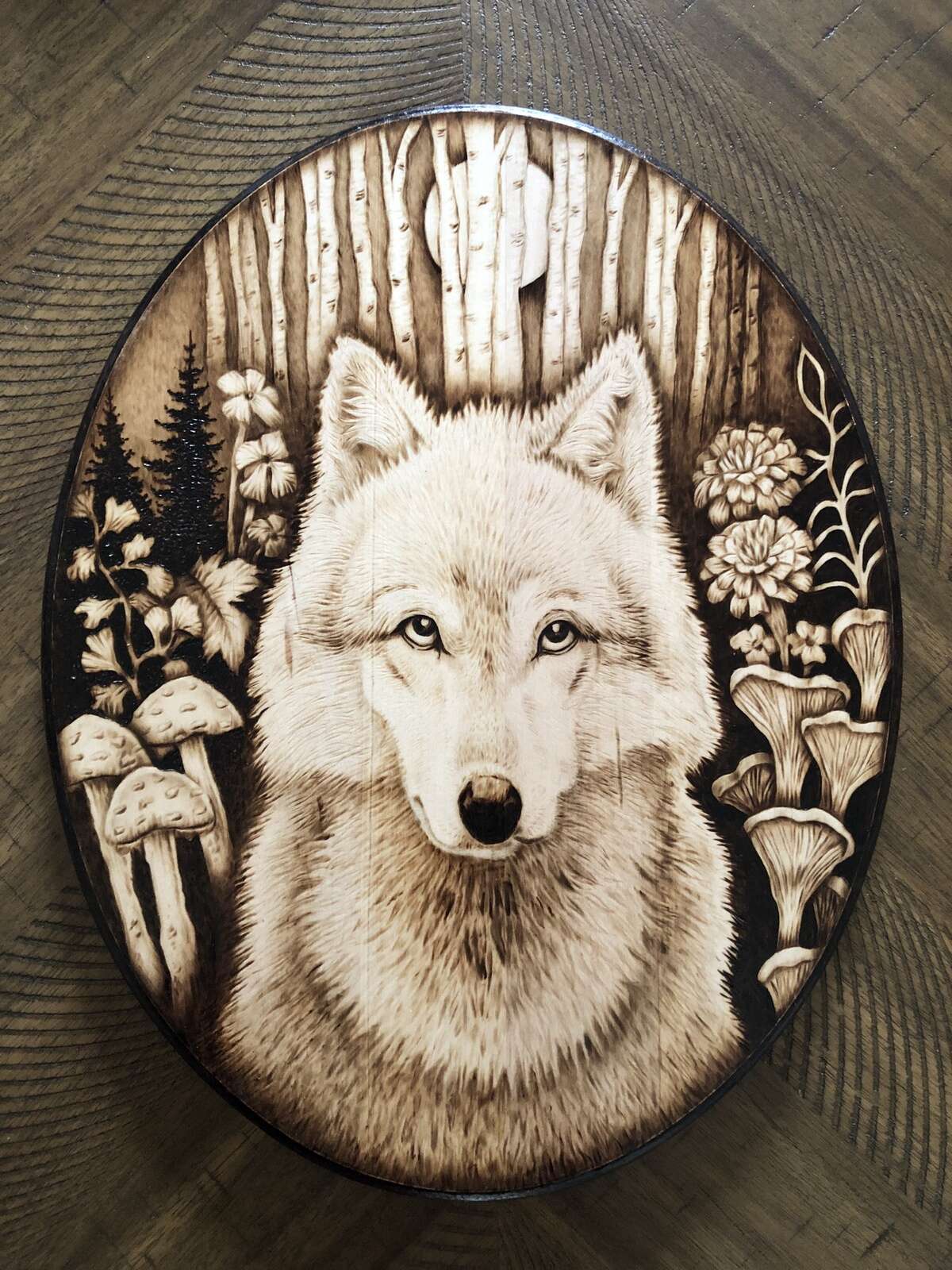 Wood burning (pyrography) is a unique process that allows Szkodzinski to create shade and depth by adjusting the temperature of her wood burning tool. Working primarily with basswood, Szkodzinski creates depth and contrast through a range of textures and techniques. Her piece, “Whispering Woods,” depicts the beauty of a wolf in a moonlit forest, with trees, flowers, and mushrooms.