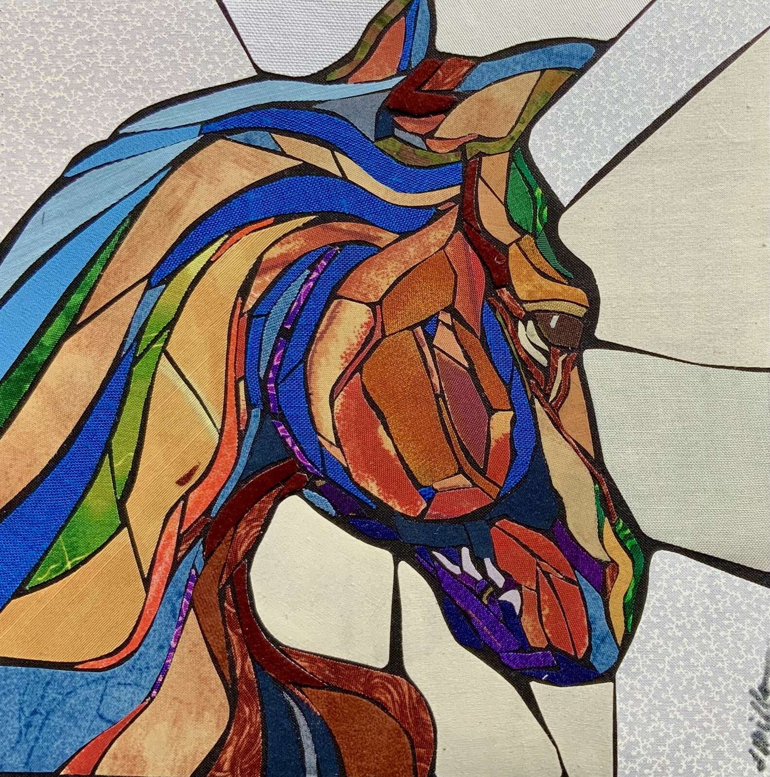 One of the out-of-state artists is Lori Miller from Iowa. Miller works as a multimedia artist and specializes in fiber collage. Her contemporary art honors the tradition of the mosaic format, using fabric as its medium. Miller’s piece, called “Shirley’s Horse,” is created using numerous cut pieces of fabric.