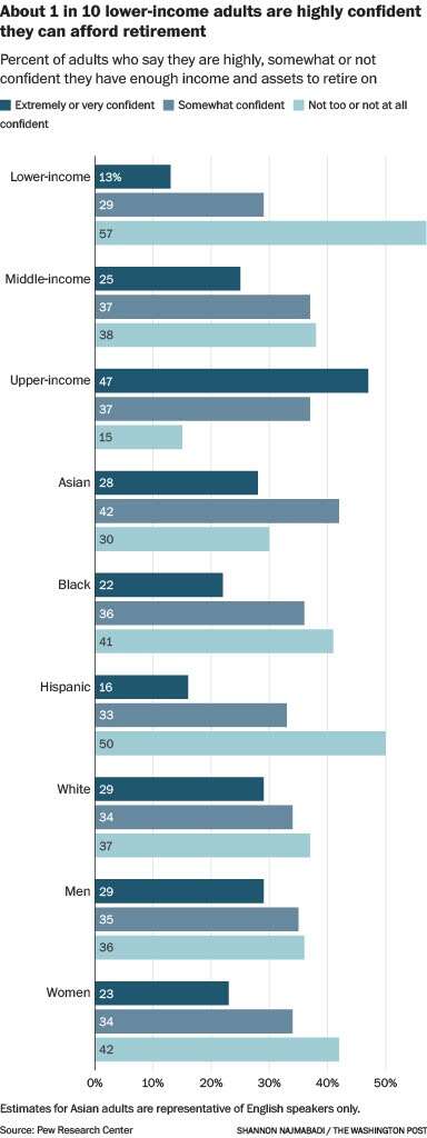 And 72% of upper-income seniors say they were highly confident they had enough money to last in retirement. For those in the lower- and middle-income brackets, the numbers drop to 21% and 46%, respectively.