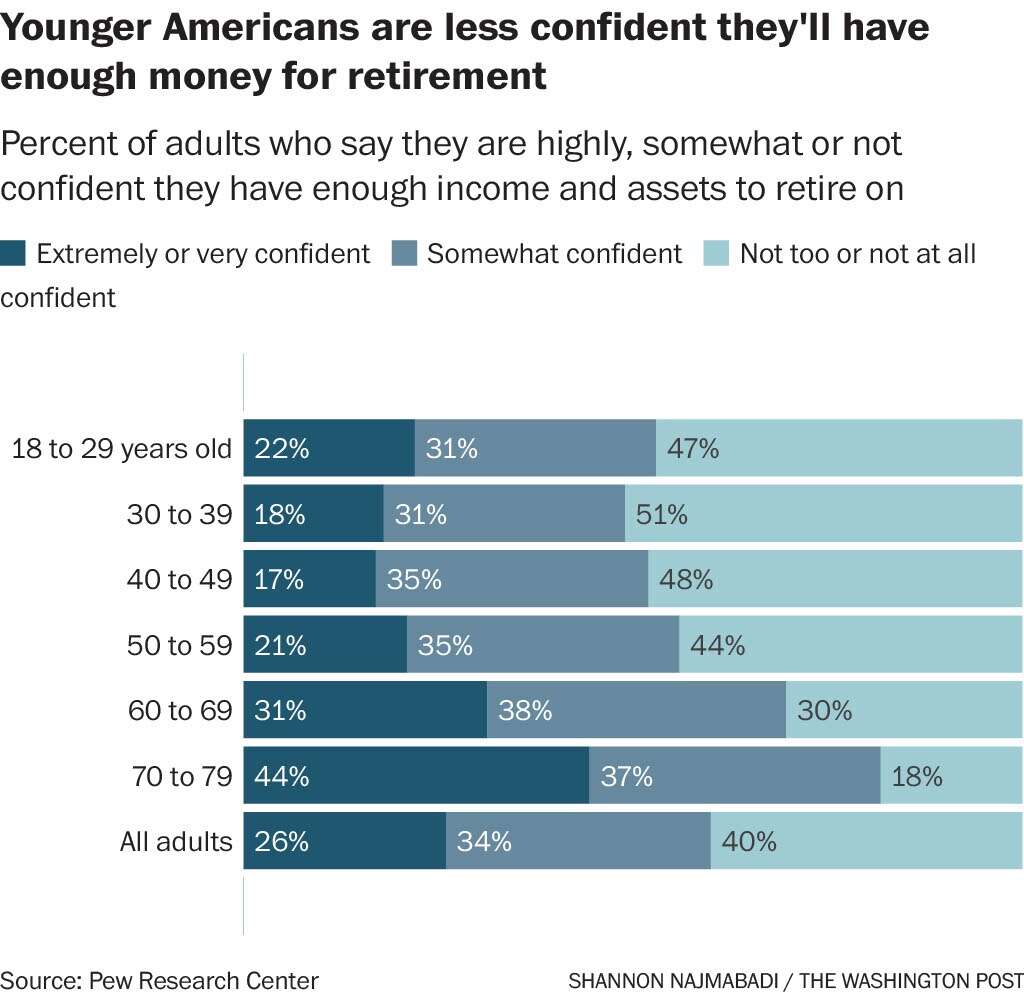 Around half of adults ages 18 to 49 said they are not confident they will have the means to retire or said they doubted they could. By contrast, 30% of those in their 60s and 18% of adults in their 70s said the same.
