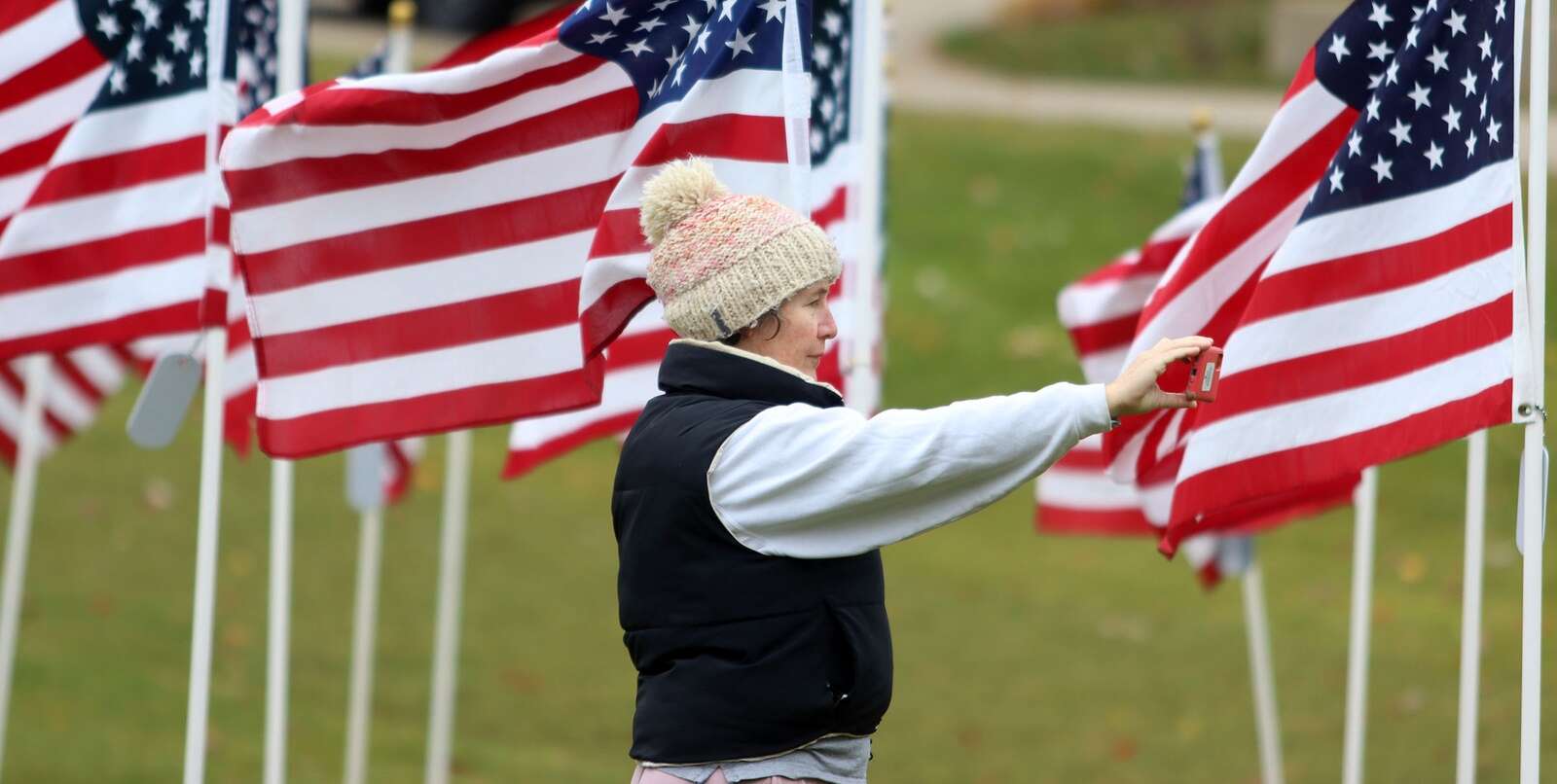 Ana Alvarez of Naperville takes a photo Sunday with some of the 1,500 U.S. flags in display as part of the Healing Field of Honor at Rotary Hill in Naperville. Patrick Kunzer for the Daily Herald