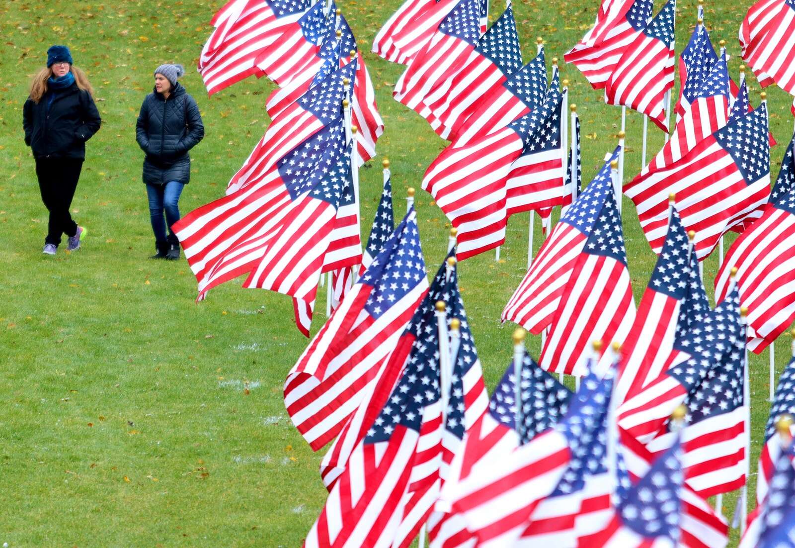 Julie Hunnicutt of Naperville, right, and Marla Anderson of Lisle stroll at Naperville Healing Field of Honor at Rotary Hill in Naperville on Sunday, Nov. 9, 2025. Patrick Kunzer/ for the Daily Herald