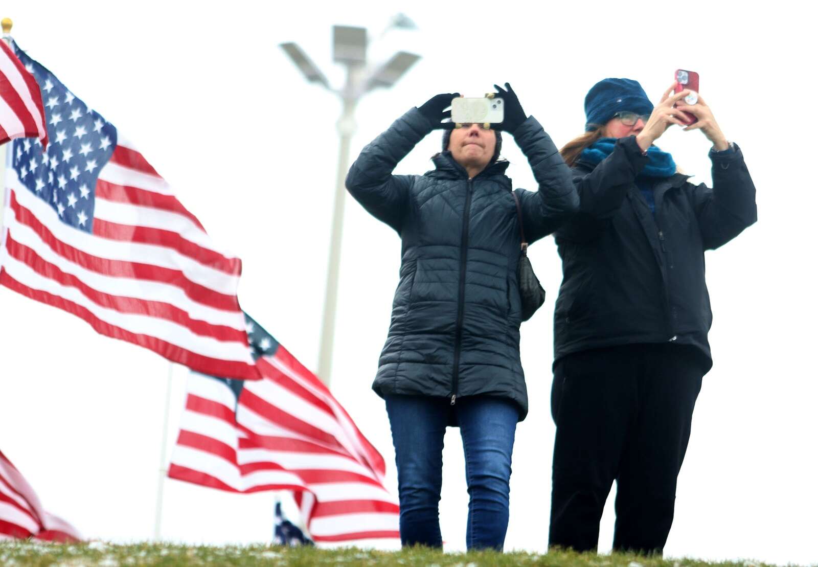 Julie Hunnicutt of Naperville, left, and Marla Anderson of Lisle take pictures of the Healing Field of Honor display Sunday at Rotary Hill in Naperville. Patrick Kunzer for the Daily Herald