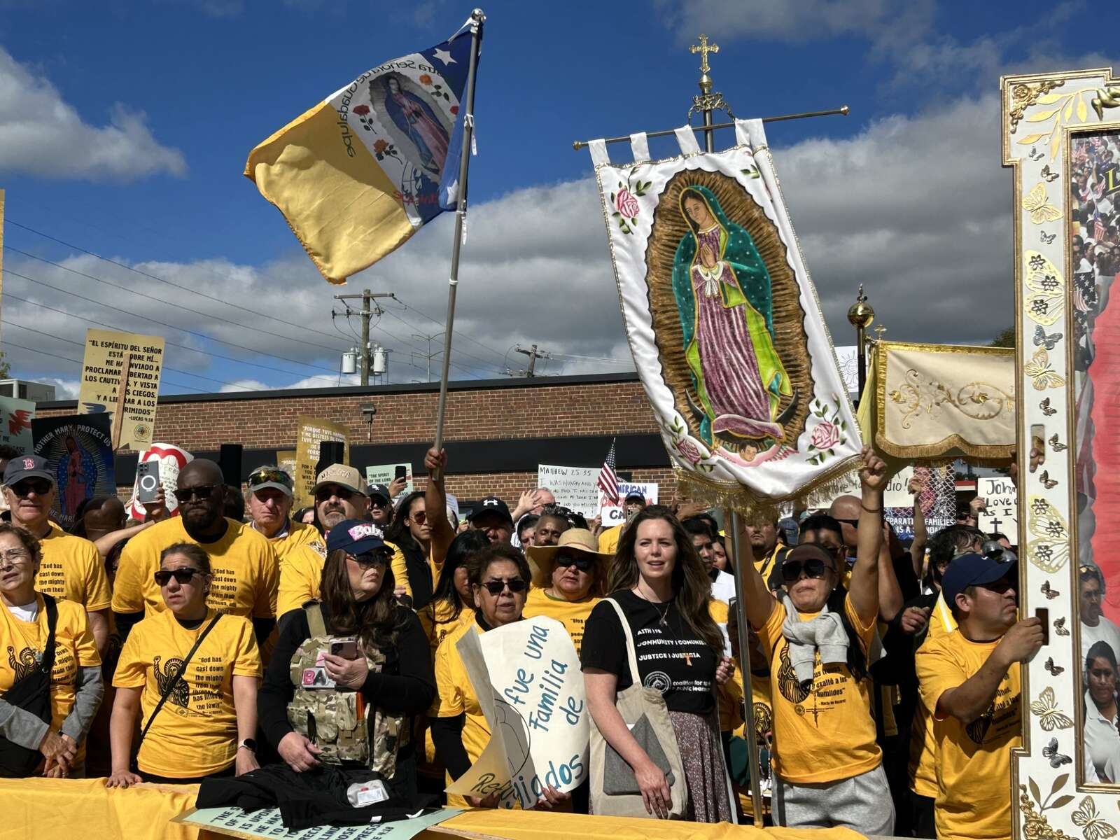 There were nearly a thousand of us marching through Maywood that day. Most wore the free yellow tee shirts that were handed out to us at the church. “God has cast down the mighty from their thrones,” the shirts proclaimed, “and has lifted up the lowly.” As we marched, we sang various hymns and recited prayers for the detainees. In spite of the size of the march, people were remarkably kind and respectful — of each other, and of the people in the neighborhood.