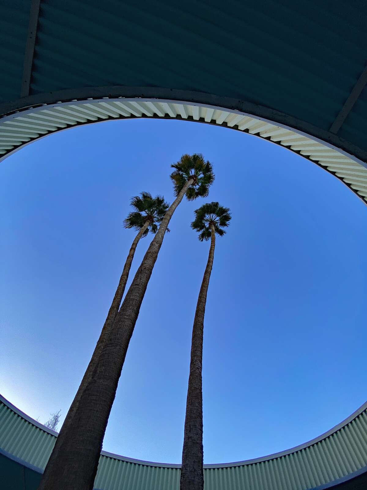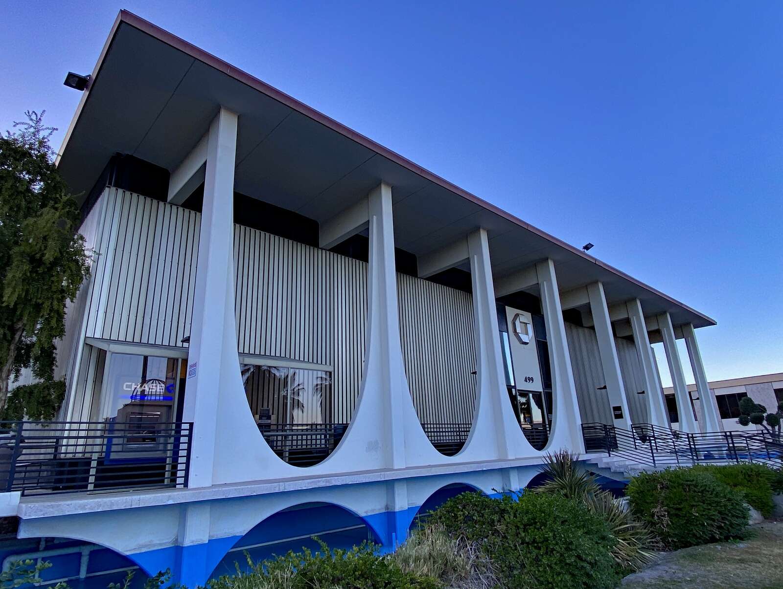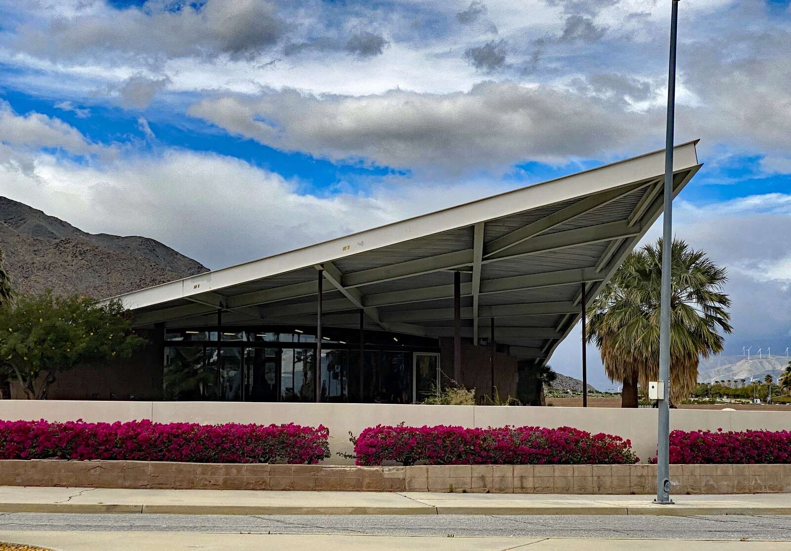 The Palm Springs City Hall built in 1952 ranks among the most noteworthy Midcentury Modern civic structures. Designed by Albert Frey and a team of architects, palm trees grow through a circular hole in a broad awning over the striking main entrance. The three trees tower above the building accentuating a low profile common in Desert Modernism, a style Frey pioneered. Another element of the style, brise soleil or breeze blocks, uses decorative shapes to create shade walls. At City Hall, the brise soleil comprises rows of angled metal tubing that let in light while shading the façade.