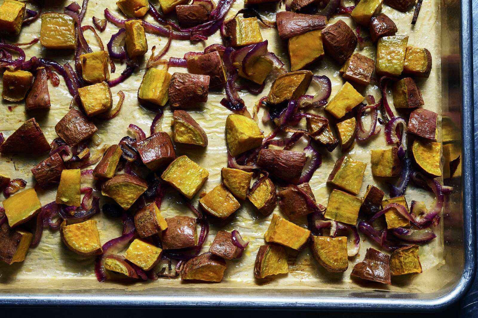 Roast the sweet potatoes and onion: Position a rack in the middle of the oven and preheat to 400°F. Line a large sheet pan with parchment paper.