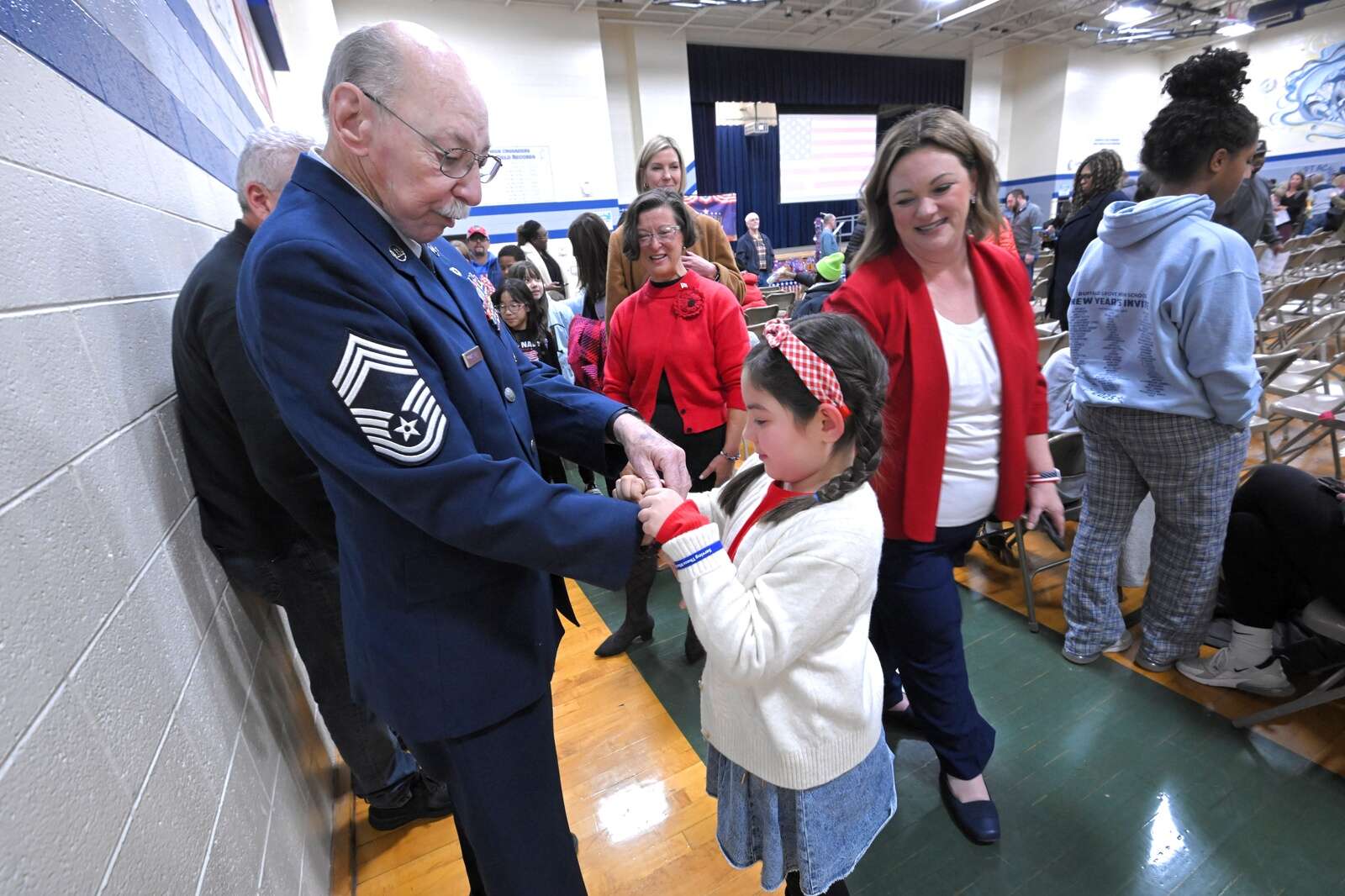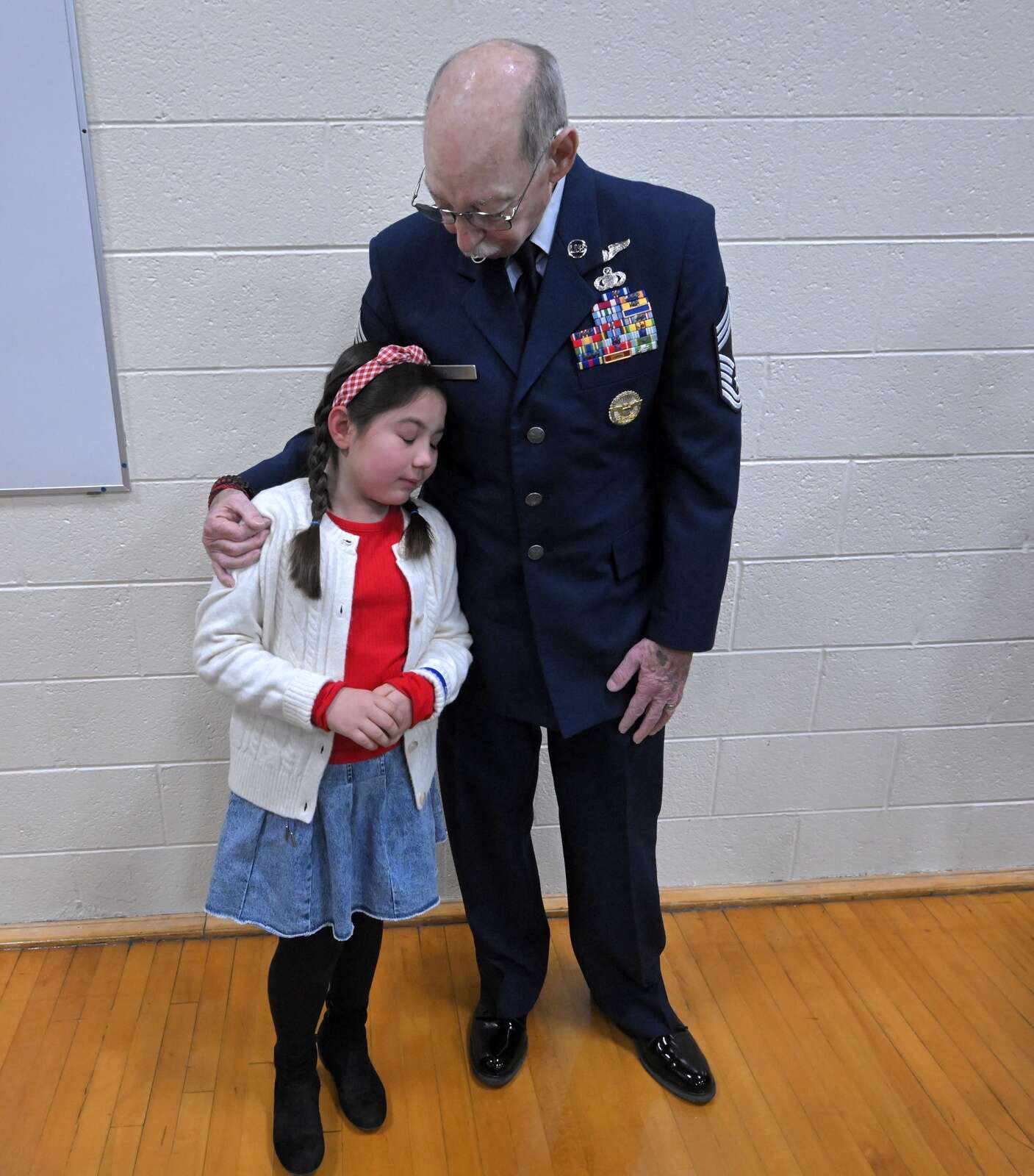 A U.S. Air Force veteran surprised his granddaughter Tuesday after she read an essay about him and his service during a crowded Veterans Day school concert in Schaumburg.