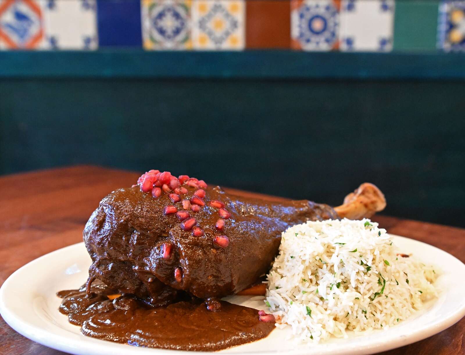 The current November specials include a turkey leg prepared confit (roasted in its own fat) and slathered with a rich pomegranate-cacao black mole sauce.