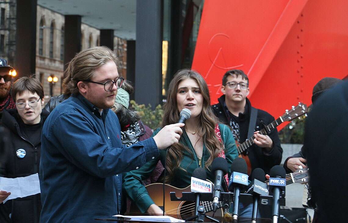 Joselyn Walsh, one of six people facing federal charges related to protests outside ICE’s Broadview facility, plays music with supporters after her arraignment Wednesday in Chicago. Capitol News Illinois photo by Maggie Dougherty