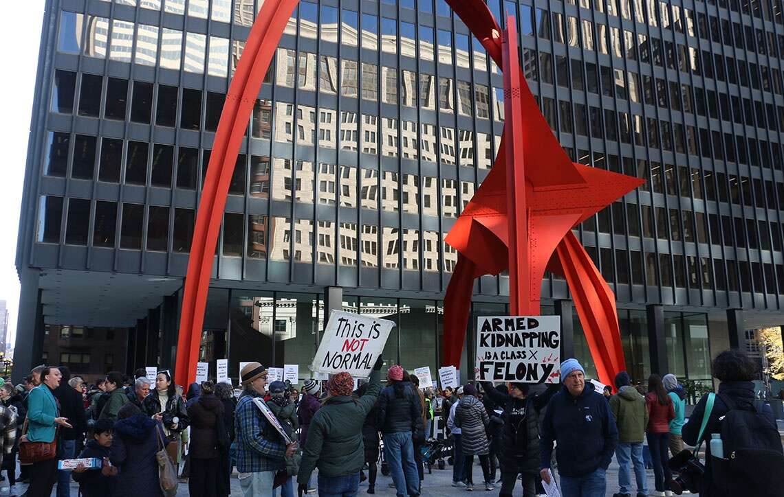 Protesters gather at Federal Plaza in Chicago to show support for the "Broadview Six," who were arraigned Wednesday afternoon. Capitol News Illinois photo by Maggie Dougherty
