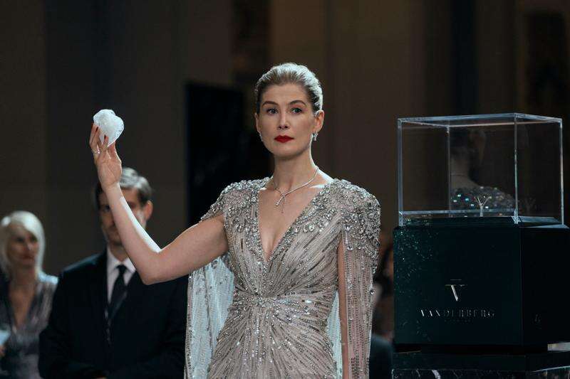 Ultra-wealthy Veronika Vanderberg (Rosamund Pike) shows off the Heart Diamond in “Now You See Me: Now You Don't.” Courtesy of Lionsgate