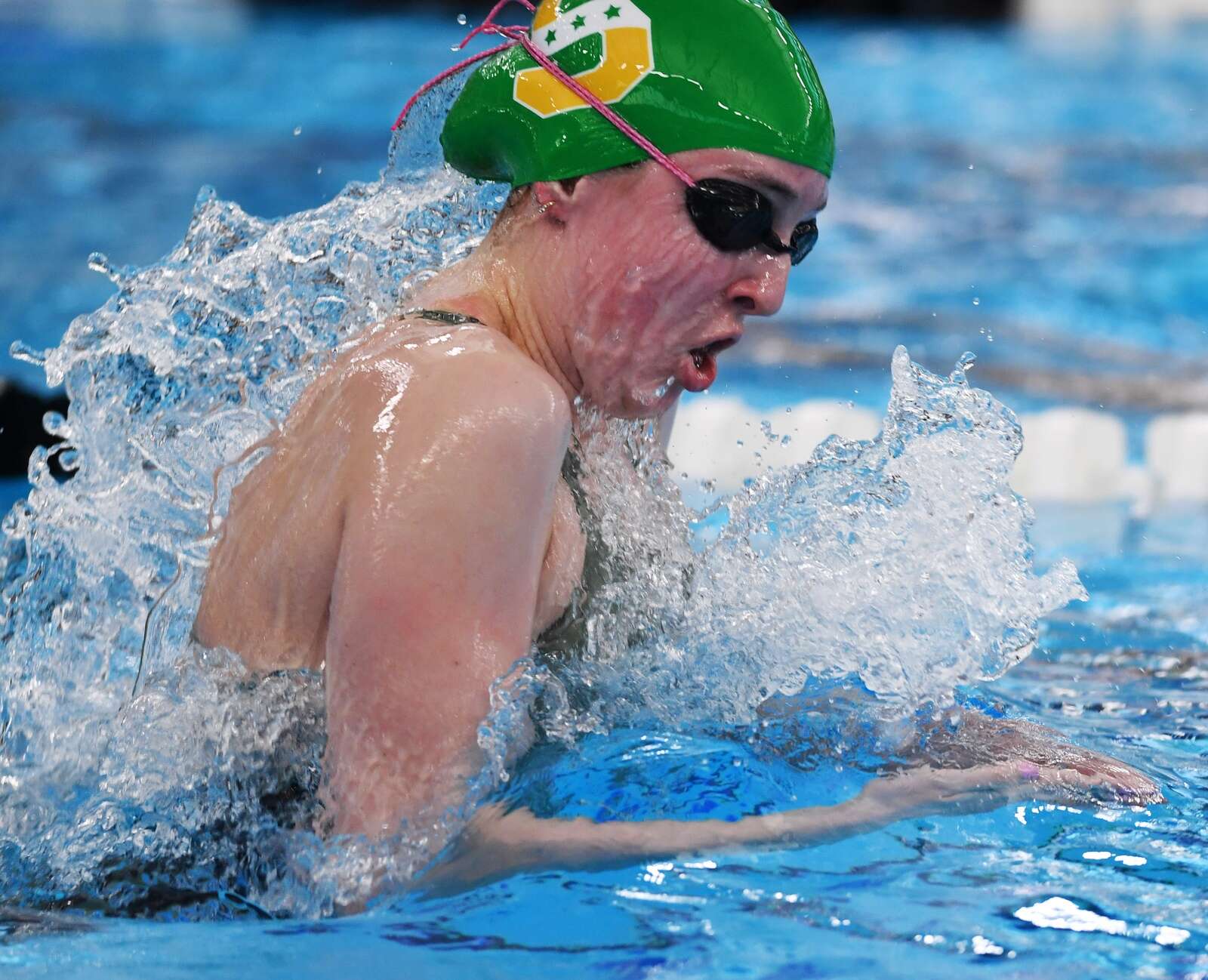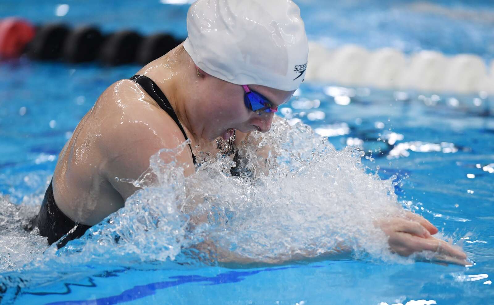 Naperville North’s Tasha Mantel swims the 100-yard breaststroke during the girls state swimming preliminaries at the FMC Natatorium on Friday, Nov. 14, 2025 in Westmont. Joe Lewnard/jlewnard@dailyherald.com