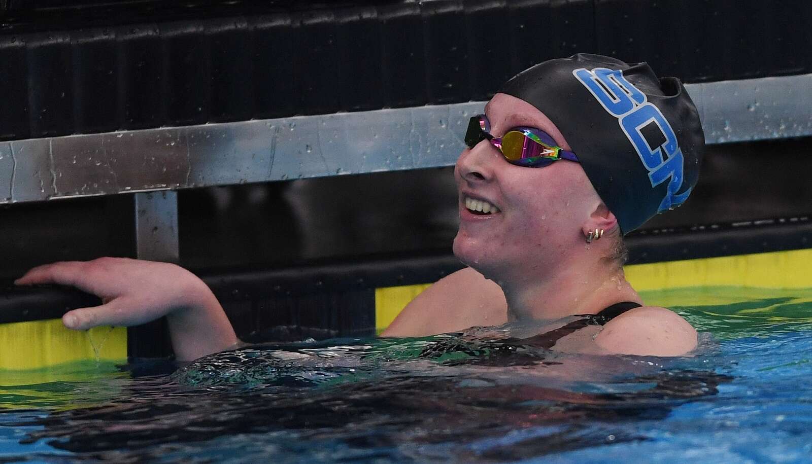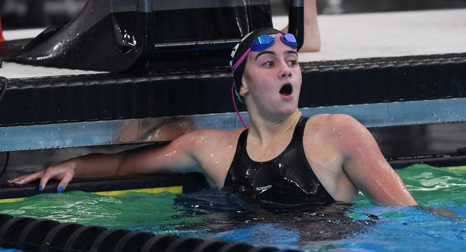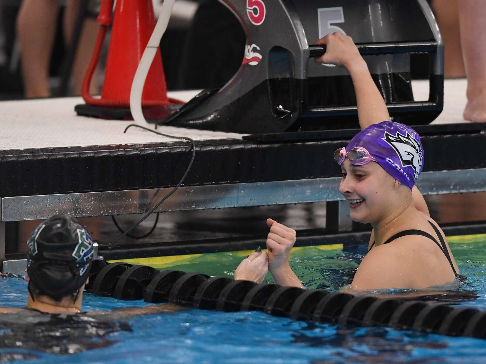 St. Charles North’s Lucia Negro reacts to her sixth-place finish in the 200-yard freestyle, which qualifies her for a spot in the finals, during the girls state swimming preliminaries at the FMC Natatorium on Friday, Nov. 14, 2025 in Westmont. Joe Lewnard/jlewnard@dailyherald.com