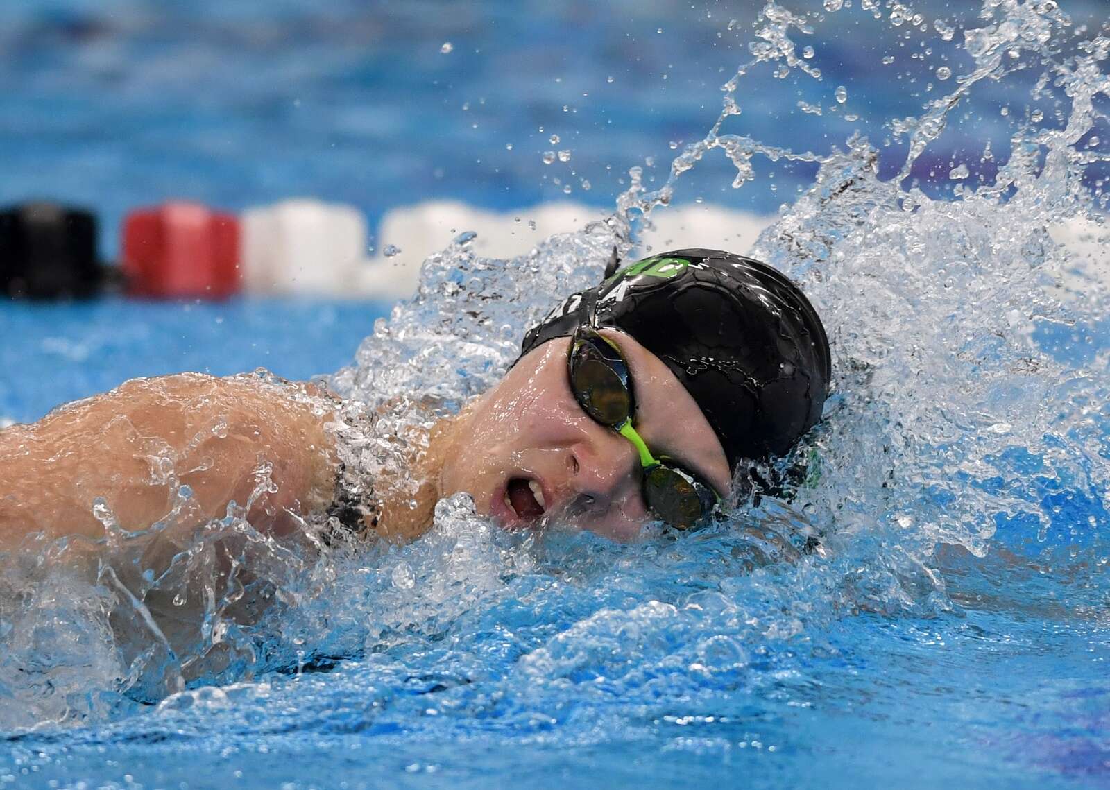Mundelein’s Amelia Willis swims the 100-yard freestyle during the girls state swimming preliminaries at the FMC Natatorium on Friday, Nov. 14, 2025 in Westmont. Joe Lewnard/jlewnard@dailyherald.com