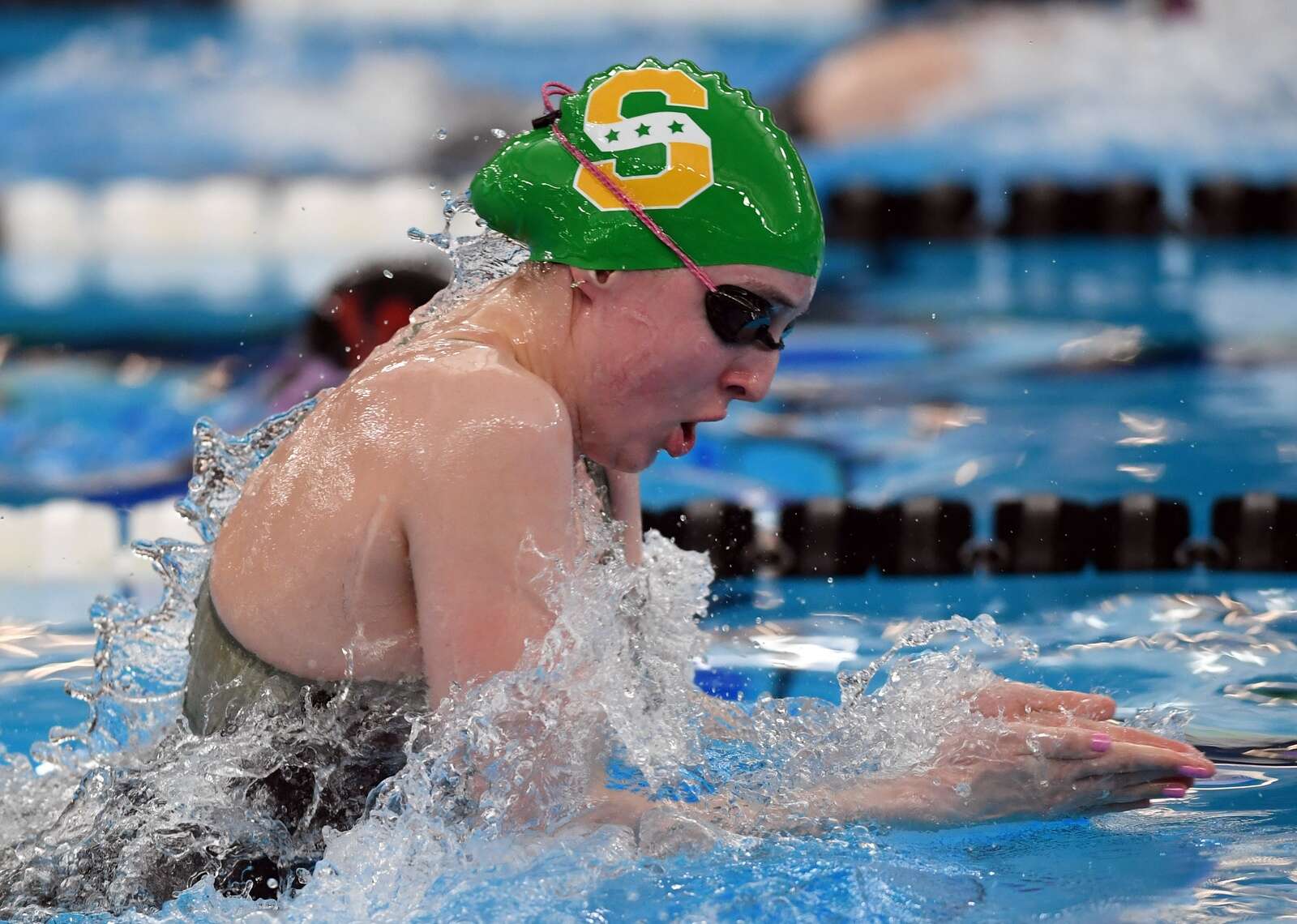 Stevenson’s Nelli Sandor swims the 100-yard breaststroke during the girls state swimming preliminaries at the FMC Natatorium on Friday, Nov. 14, 2025 in Westmont. Joe Lewnard/jlewnard@dailyherald.com