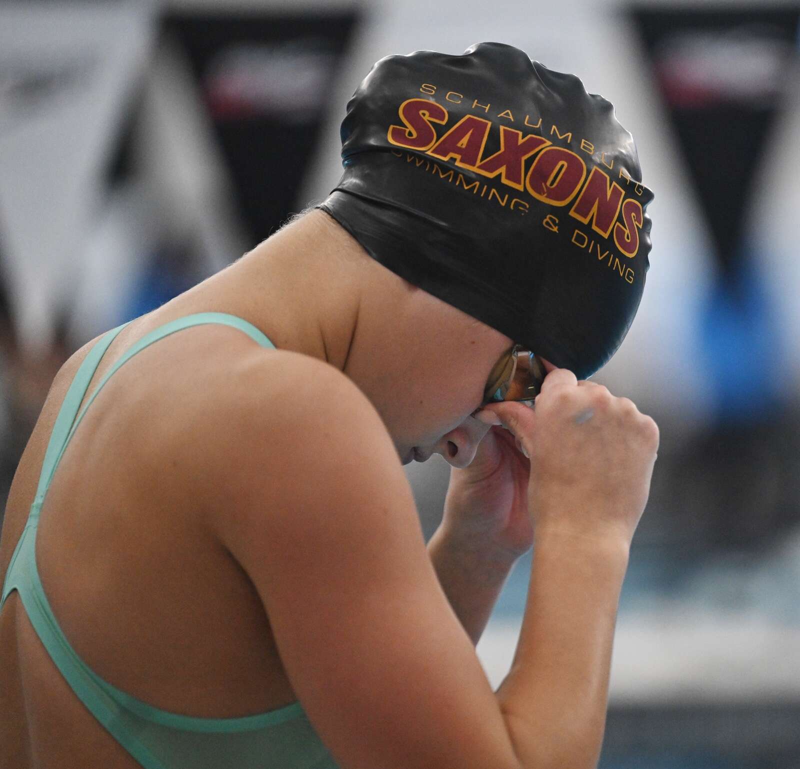 Schaumburg’s Diana Bobiv adjusts her goggles before swimming the 100-yard butterfly during the girls state swimming preliminaries at the FMC Natatorium on Friday, Nov. 14, 2025 in Westmont. Joe Lewnard/jlewnard@dailyherald.com