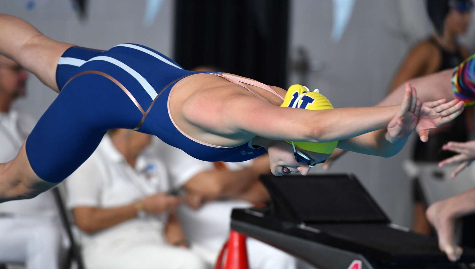Neuqua Valley’s Sofia Piater leaves the starting block in the 50-yard freestyle during the girls state swimming and diving finals at the FMC Natatorium on Saturday, Nov. 15, 2025 in Westmont.