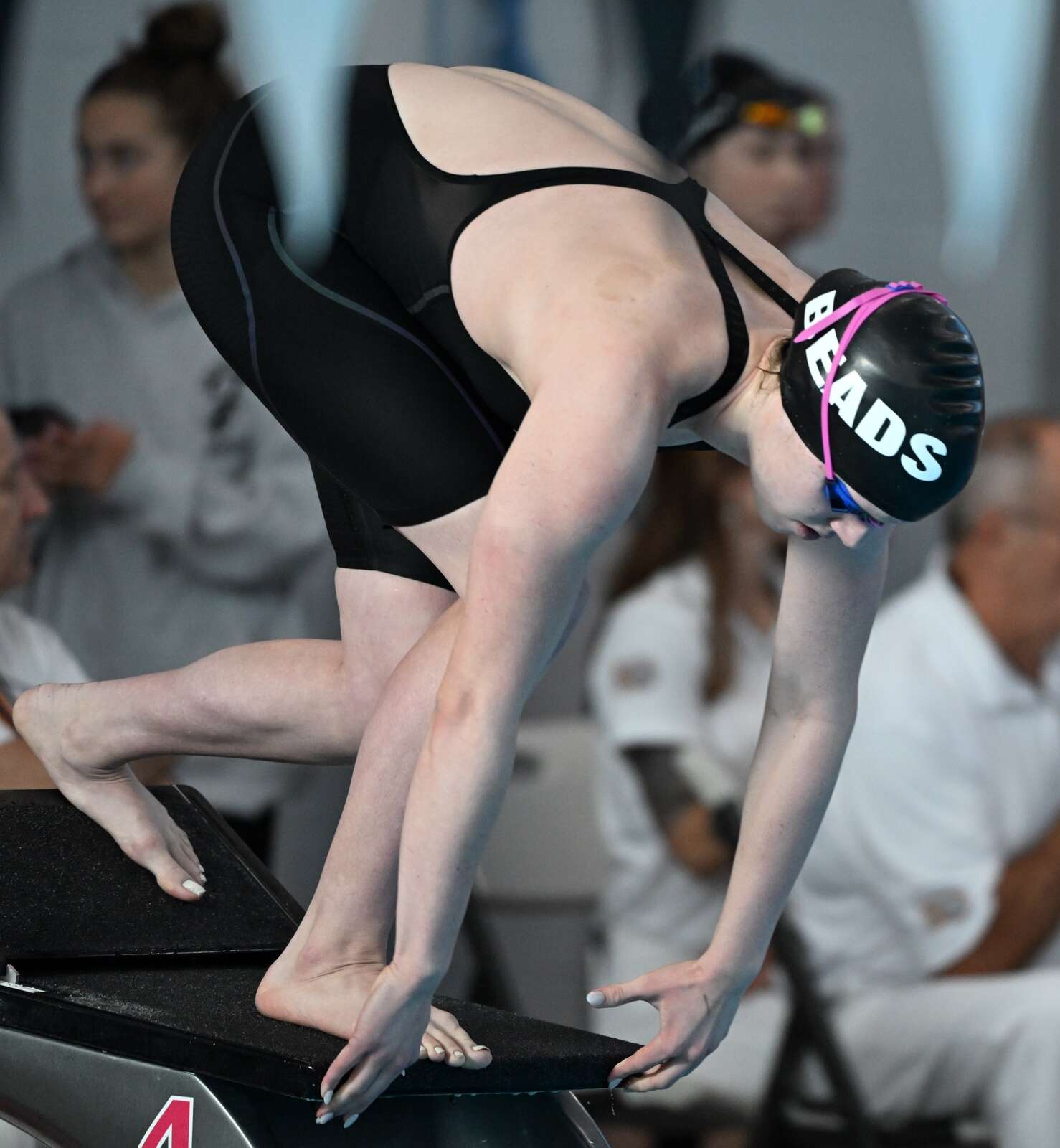 Stevenson’s Heidi Swerkun gets ready for the start of the 100-yard breaststroke during the girls state swimming and diving finals at the FMC Natatorium on Saturday, Nov. 15, 2025 in Westmont. Her third-place finish helped the Patriots win a state championship.