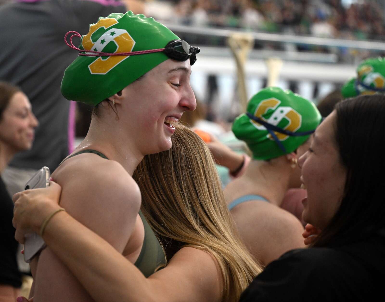 Stevenson’s Aria Grossenbach, right, who finished first in the 100-yard freestyle, hugs second-place finisher Ellie Patla of Fremd during the girls state swimming and diving finals at the FMC Natatorium on Saturday, Nov. 15, 2025 in Westmont.