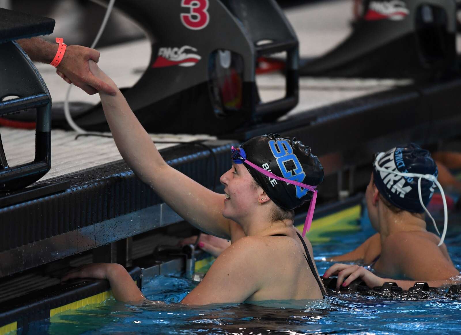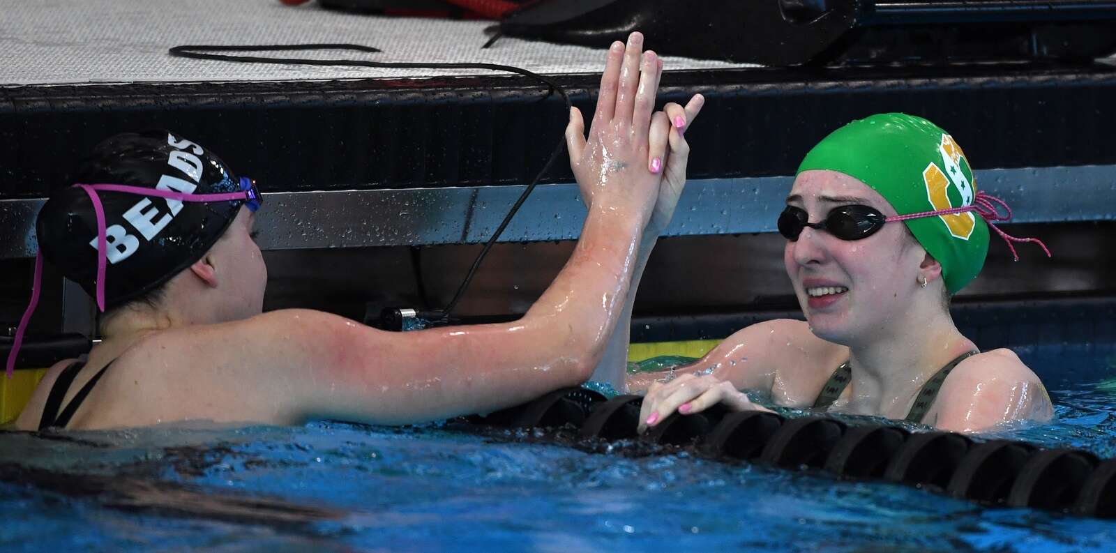 Stevenson’s Nelli Sandor, right, high fives Rosary’s Abby Moore after they finished first and second, respectively, in the 100-yard breaststroke during the girls state swimming and diving finals at the FMC Natatorium on Saturday, Nov. 15, 2025 in Westmont.