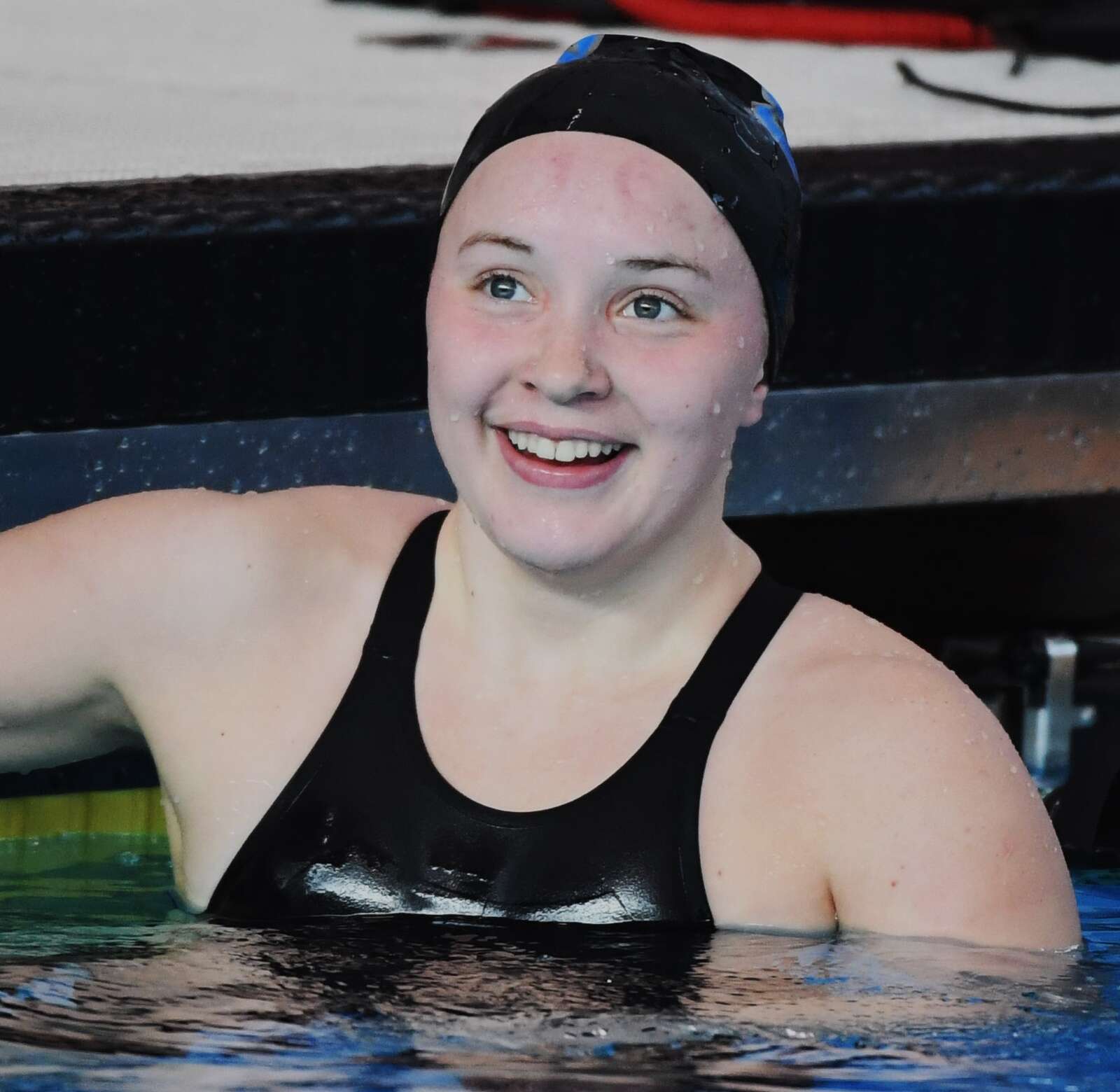 St. Charles North’s Kate Farrell smiles after winning the 200-yard individual medley during the girls state swimming and diving finals at the FMC Natatorium on Saturday, Nov. 15, 2025 in Westmont.