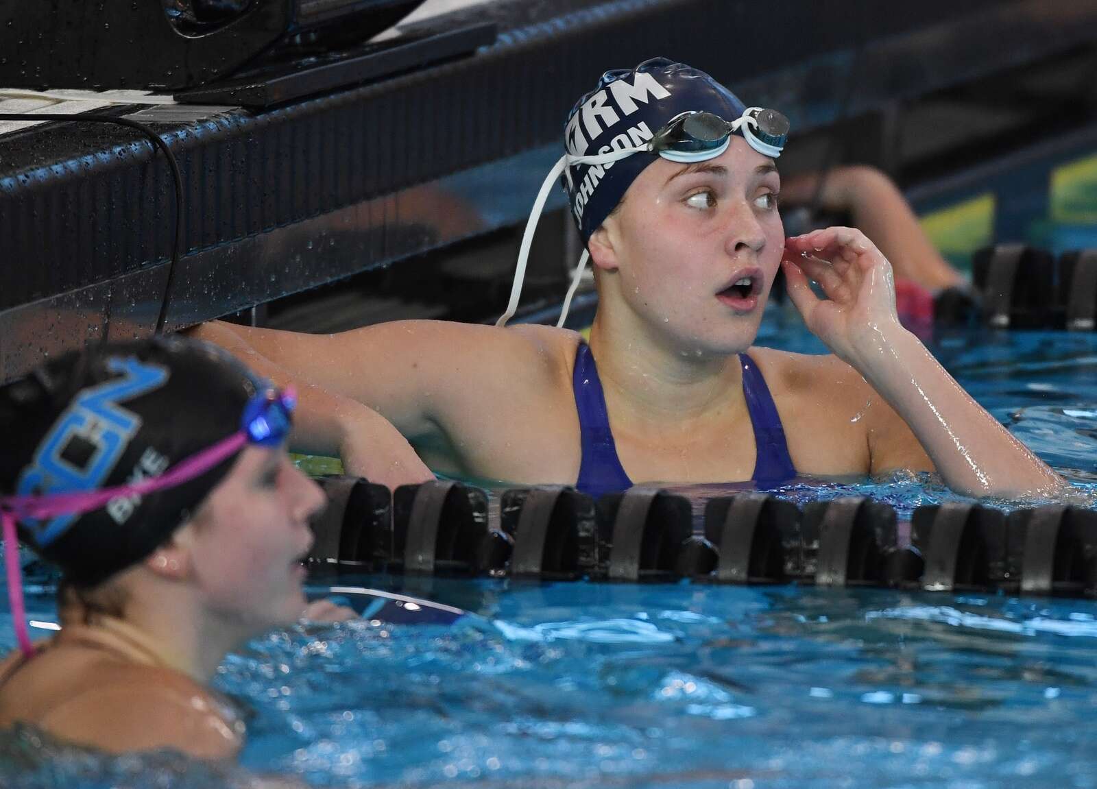 Dundee-Crown’s Rachel Johnson views her time of 54.61 after finishing third in the 100-yard backstroke during the girls state swimming and diving finals at the FMC Natatorium on Saturday, Nov. 15, 2025 in Westmont.