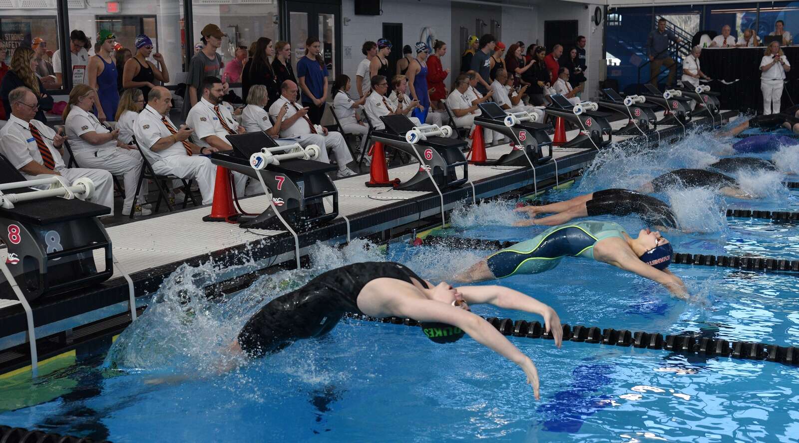Stevenson’s Aria Grossenbach leaves the starting block in the 200-yard freestyle relay during the girls state swimming and diving finals at the FMC Natatorium on Saturday, Nov. 15, 2025 in Westmont.