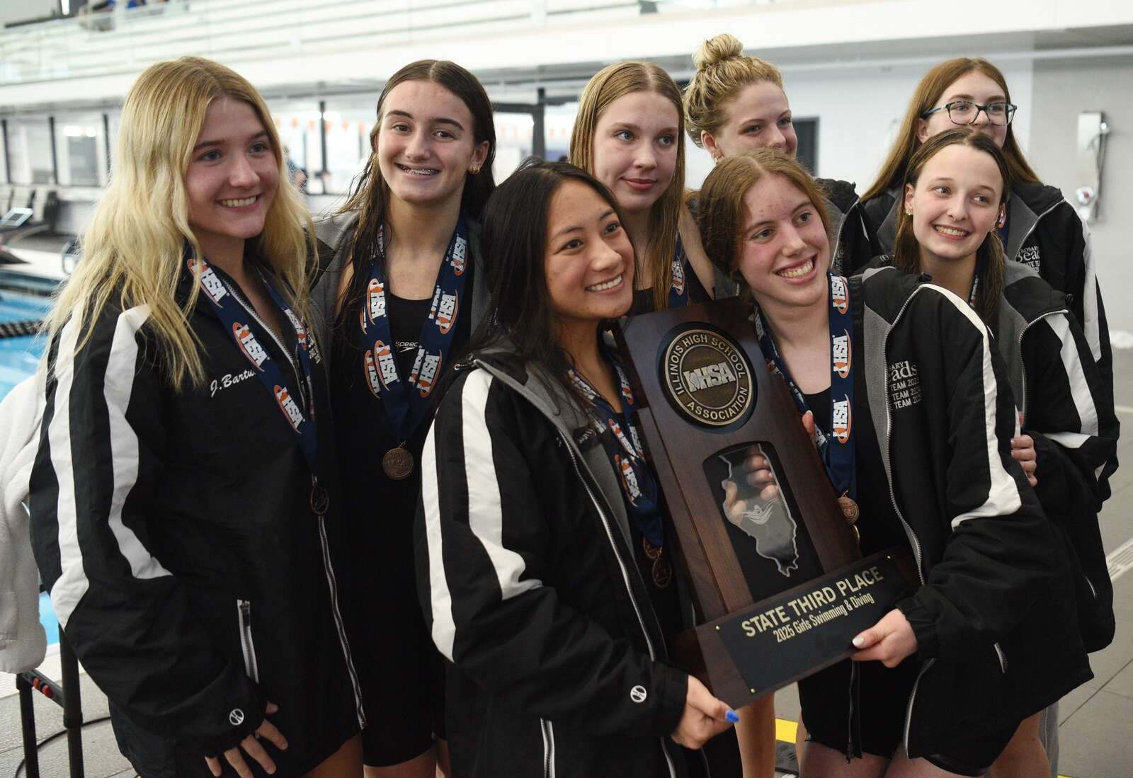 Rosary swimmers hold their third-place trophy at the conclusion of the girls state swimming and diving finals at the FMC Natatorium on Saturday, Nov. 15, 2025 in Westmont.