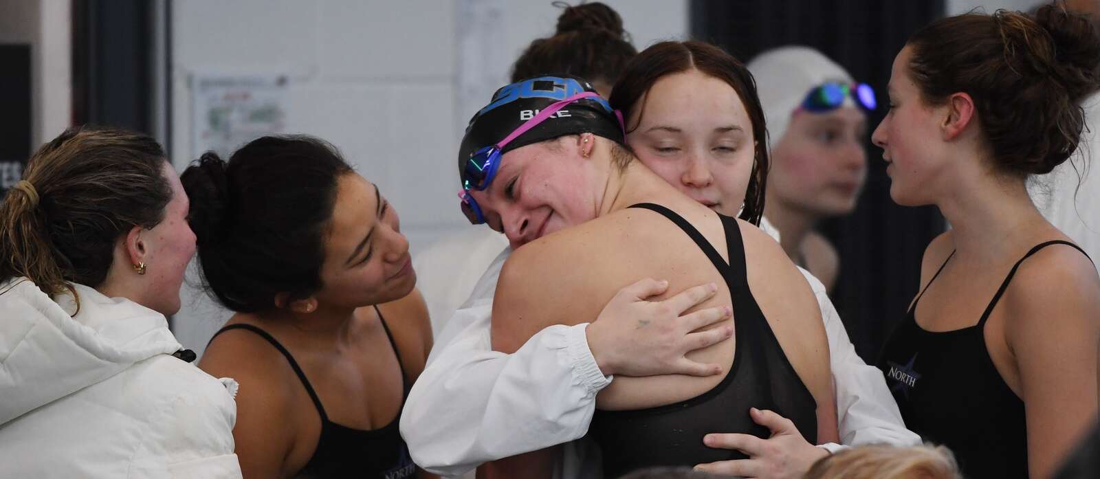 St. Charles North’s Thea Bike, middle, celebrates with teammates after winning the 100-yard backstroke during the girls state swimming and diving finals at the FMC Natatorium on Saturday, Nov. 15, 2025 in Westmont.