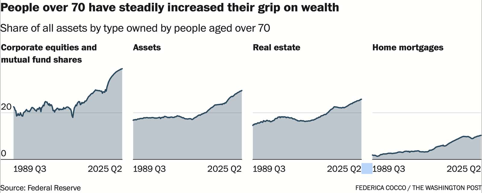 The reasons come down to timing and time: Americans 75 and older bought homes and invested in stocks well before such assets exploded in value, according to Edward Wolff, an economics professor at New York University. In a working paper for the National Bureau of Economic Research, he examined the four decades between 1983 and 2022 when those older boomers’ saw their wealth climb and their younger peers recorded relative declines.