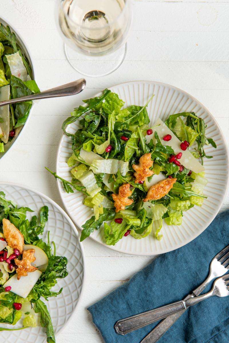 Thanksgiving salad with pears, Parmesan and pomegranate seeds, starring puff pastry croutons