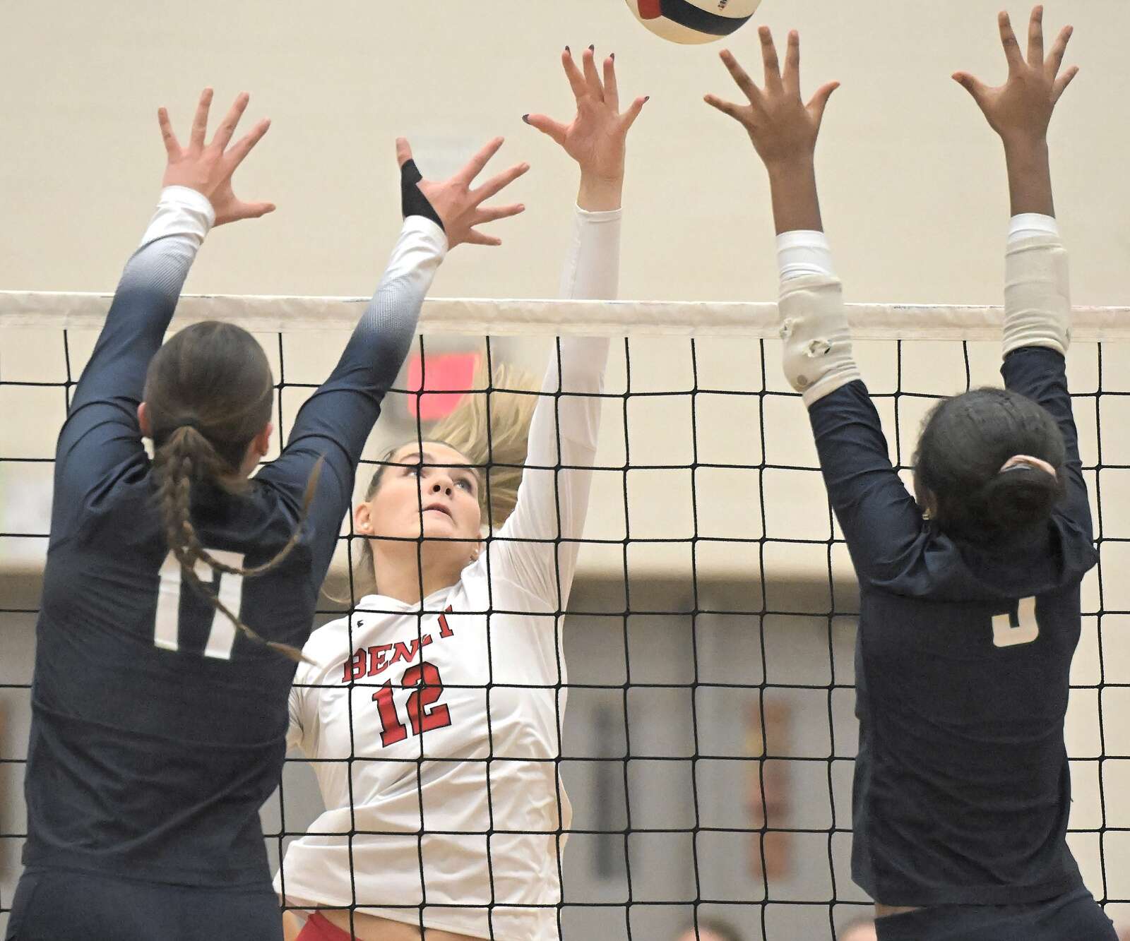 Benet’s Lynney Tarnow stretches to get the ball past New Trier’s Calia Cremascoli and Harper Payne in a supersectional girls volleyball match Monday, Nov. 10, 2025 in Bartlett. John Starks/jstarks@dailyherald.com