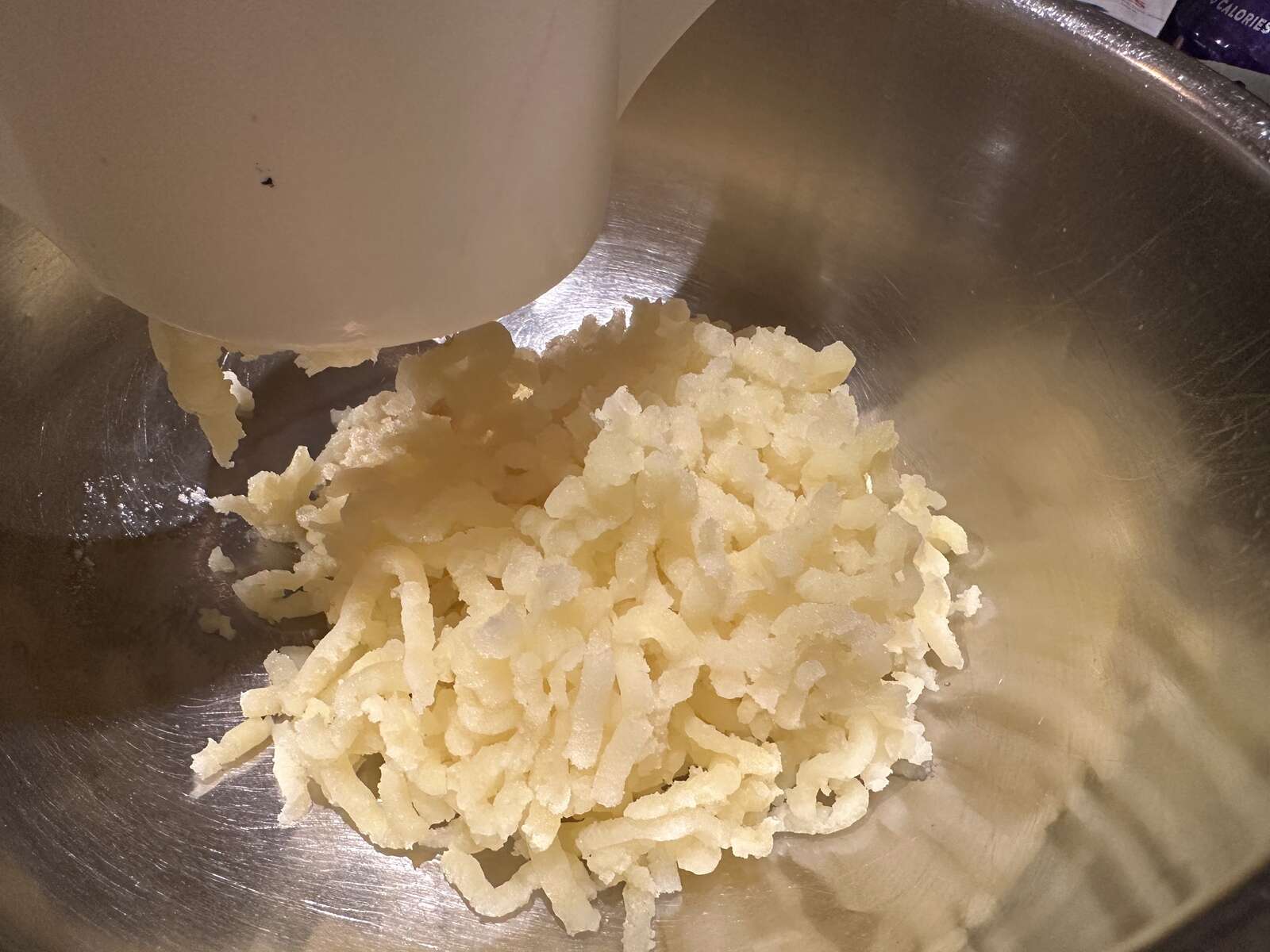Once drained, allow potatoes to cool slightly, remove skin and press through a food mill or potato ricer. Don’t worry if you don’t have either of these. You can use a rubber spatula to press the potatoes through a small-holed vegetable strainer instead, and the results will be similar.