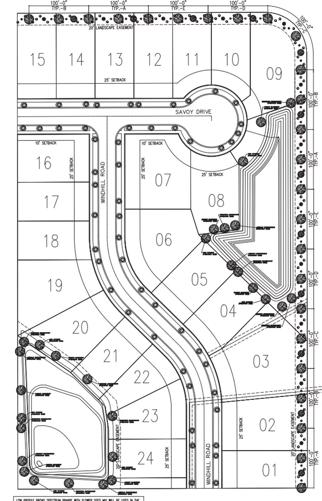 Two streets in nearby developments will be extended: Savoy Drive will extend east and Windhill Lane will extend north, meeting at a T-shaped intersection with a cul-de-sac to the east.