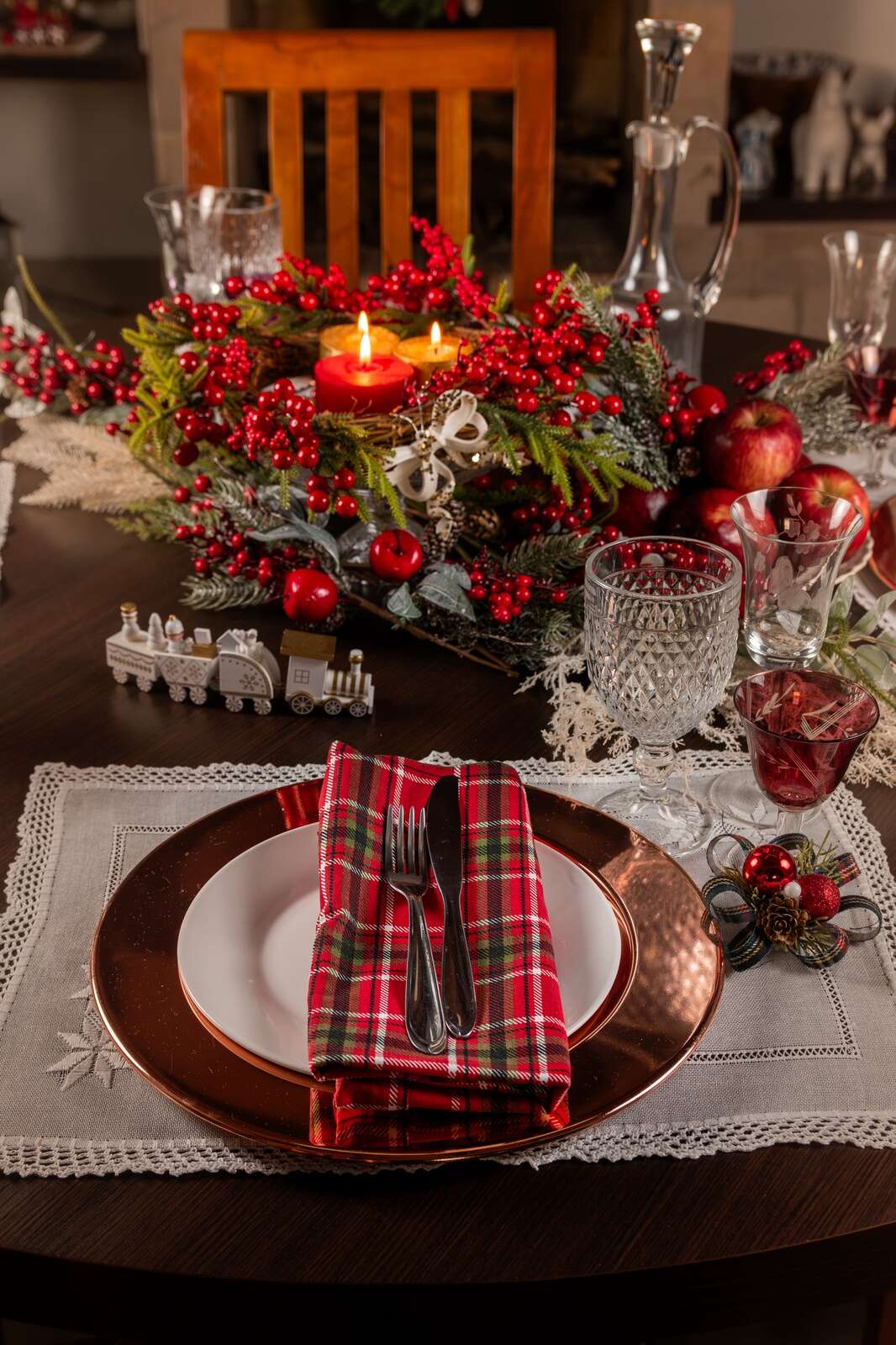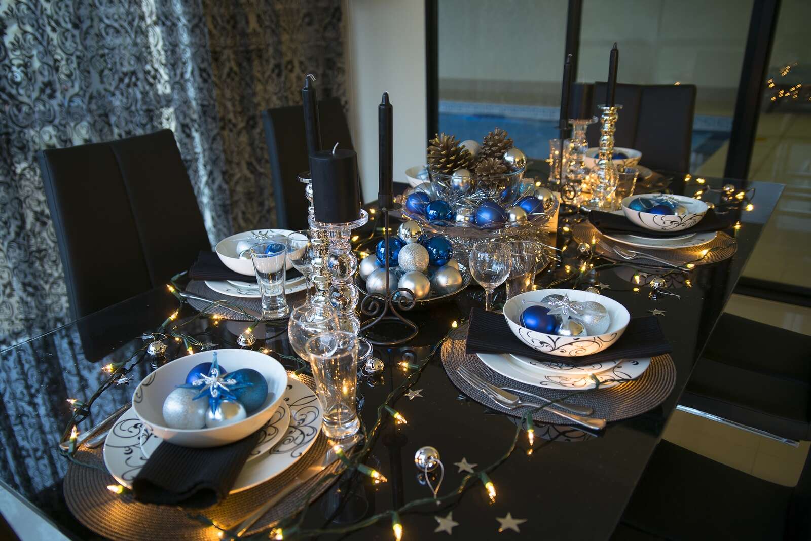 • Go big with your candlesticks. Gather five to seven instead of just a pair, and stick to one material like silver, mercury glass, or ceramic in different heights for a bold look. Finish it off with a unique table runner made from leftover fabric or eye-catching holiday paper to add contrast and style to your table.