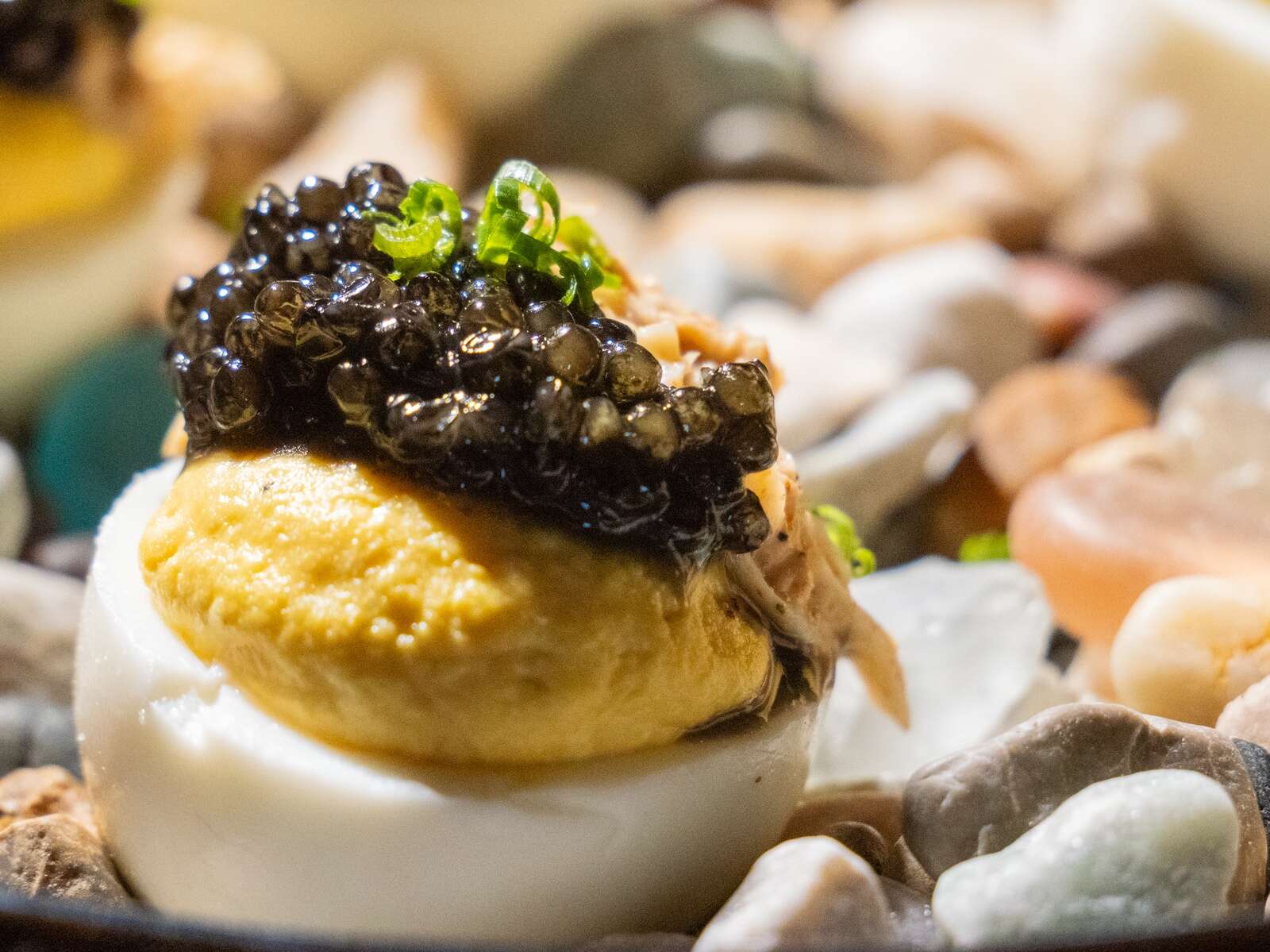 Caviar and crabmeat make the perfect complement to dress up the deviled egg. The flavors are elegant yet bring nostalgia and are great made a day ahead.