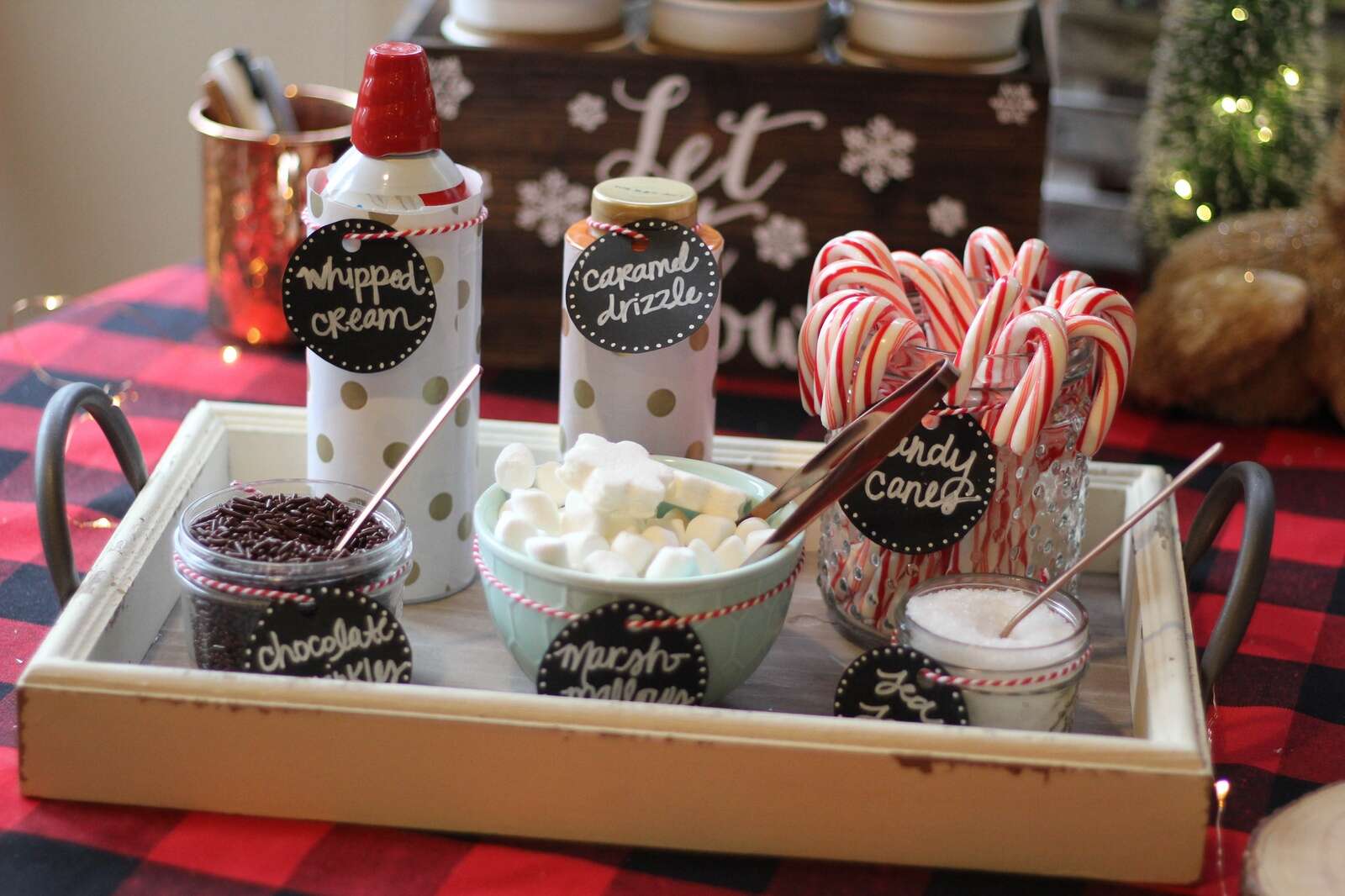 • A self-serve hot chocolate bar. “Set it up with festive mugs, and offer a few variations of hot chocolate — such as peppermint, classic, and Mexican spice. For adults, include liquors like urban, Irish cream, or rum cream,” recommends Hodge.