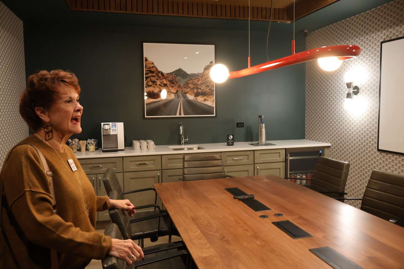 Village Trustee Casey Rooney checks the facilities at the recent opening of Brick & Mortar co-working space in downtown Libertyville. Courtesy of GLMV Chamber of Commerce