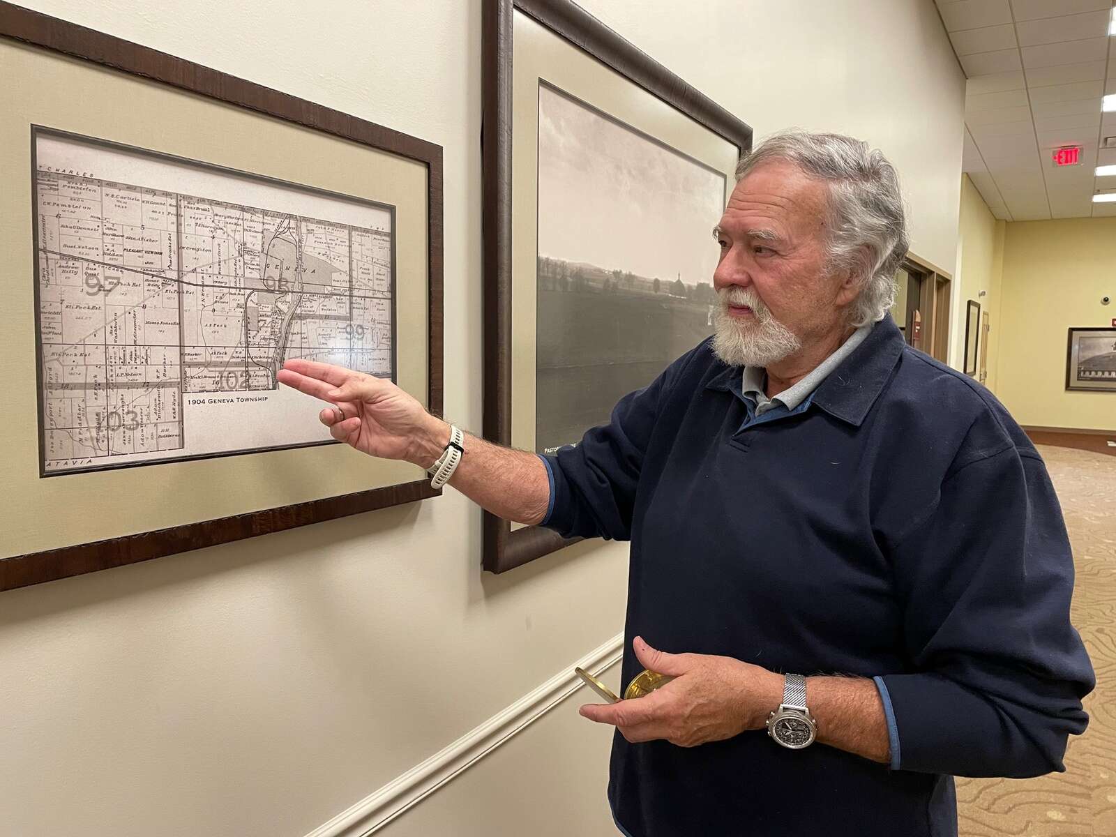 Looking at historic documents framed at the Persinger Recreation Center in Geneva, John Schubert points out on an 1871 plat of survey where the Peck family acquired property in Geneva Township. Courtesy of Dave Heun