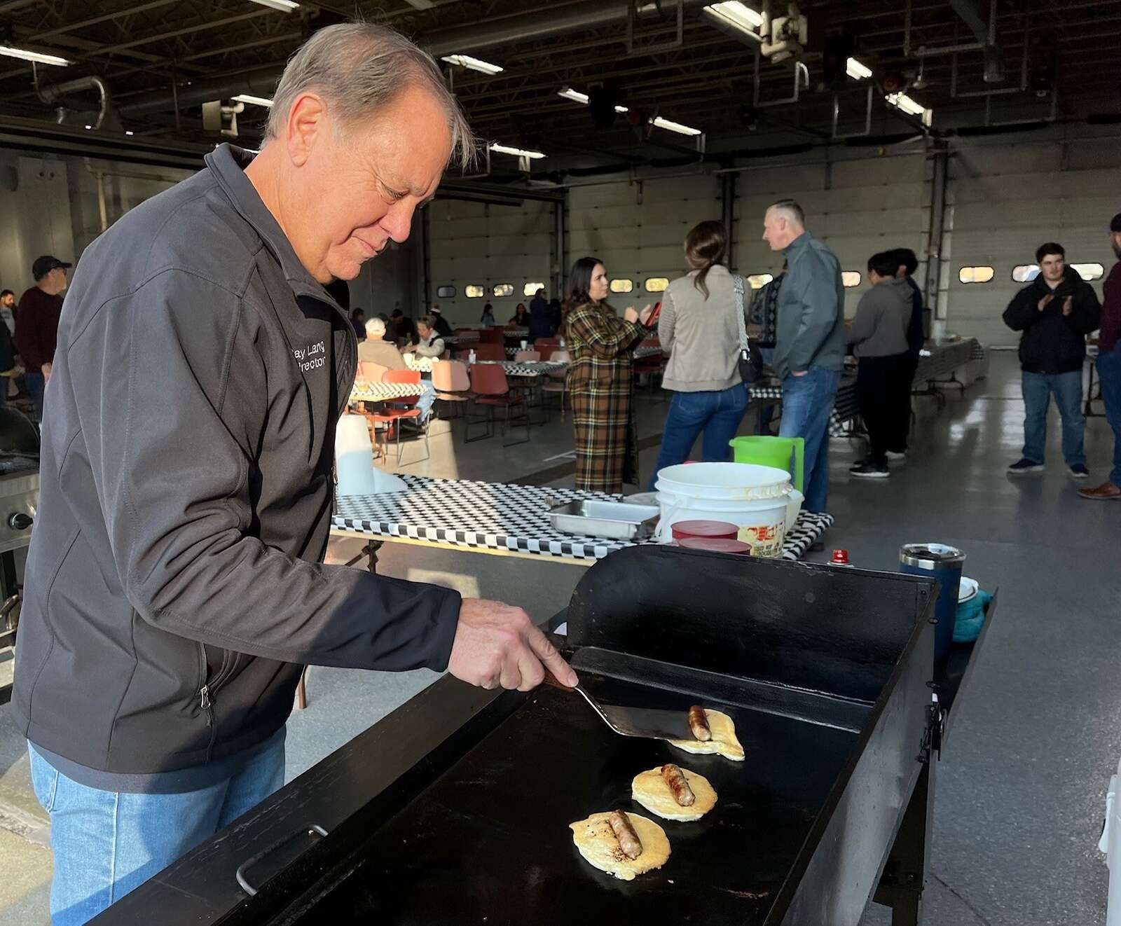Village trustees Ray Lang and Joe Vito cooked pancakes and sausages for the hungry diners while other trustees and volunteers served customers from a long table that also offered fresh fruit, pastries, coffee and orange juice.