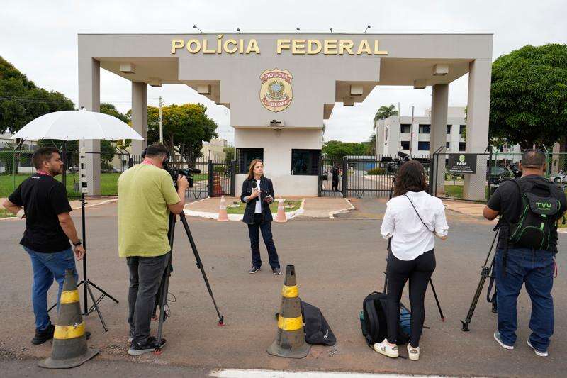 Journalists gather outside the Federal Police headquarters, where Brazil's former President Jair Bolsonaro is under arrest, in Brasilia, Brazil, Saturday, Nov. 22, 2025. (AP Photo/Eraldo Peres) (AP Photo/Eraldo Peres)