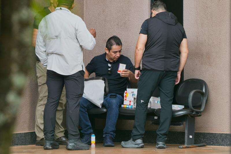 Eduardo Torres, center, brother in law of Brazil's former President Jair Bolsonaro, sorts Bolsonaro's medications at the Federal Police headquarters, in Brasilia, Brazil, Saturday, Nov. 22, 2025 after Brazil's Federal Police arrested Bolsonaro preemptively on Saturday. (AP Photo/Eraldo Peres) (AP Photo/Eraldo Peres)