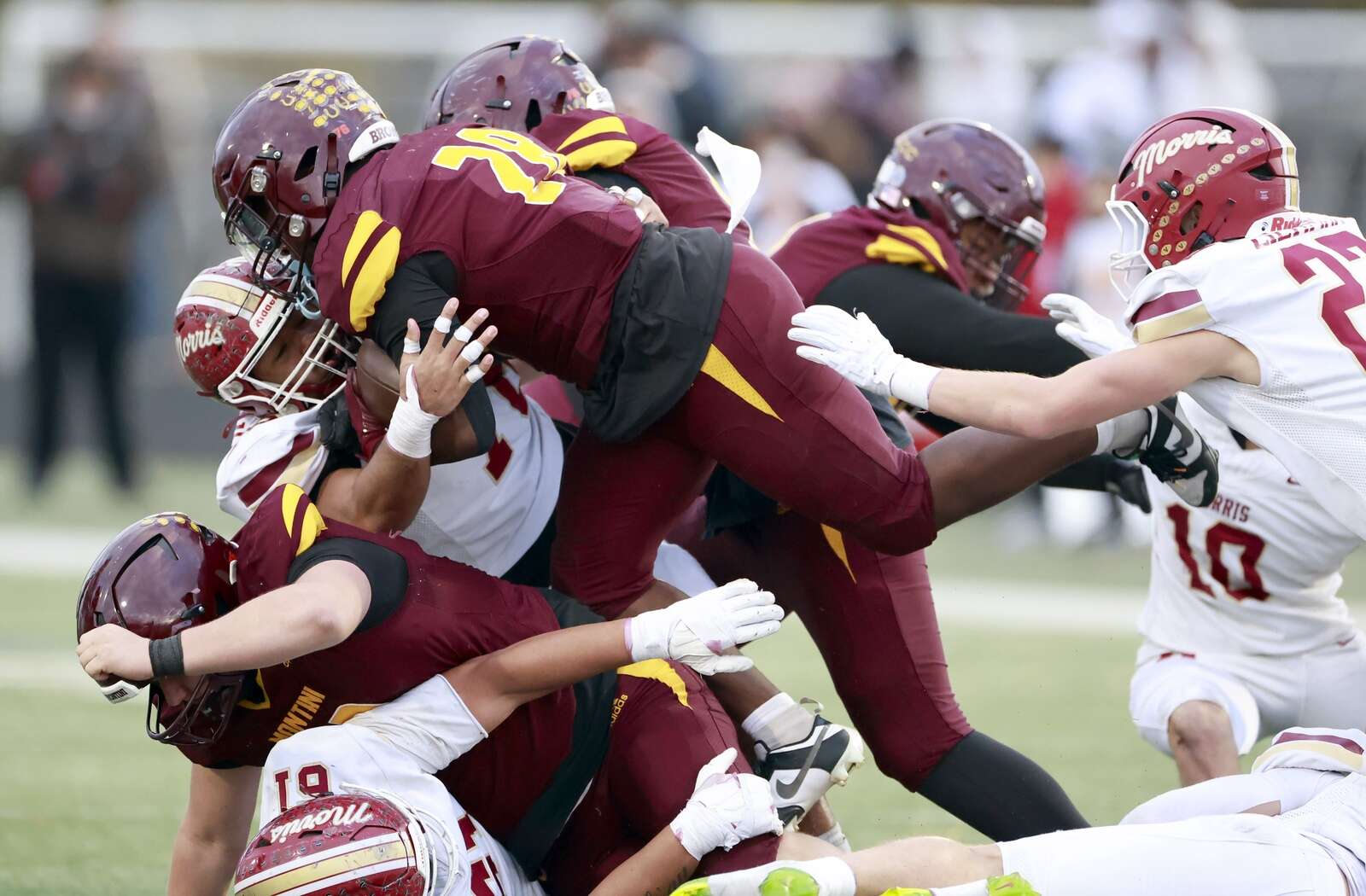 Morris' Brady Babington (30) moves through a host of Montini players during the IHSA Class 4A semifinals football playoff game Saturday, Nov. 22, 2025 in Lombard.