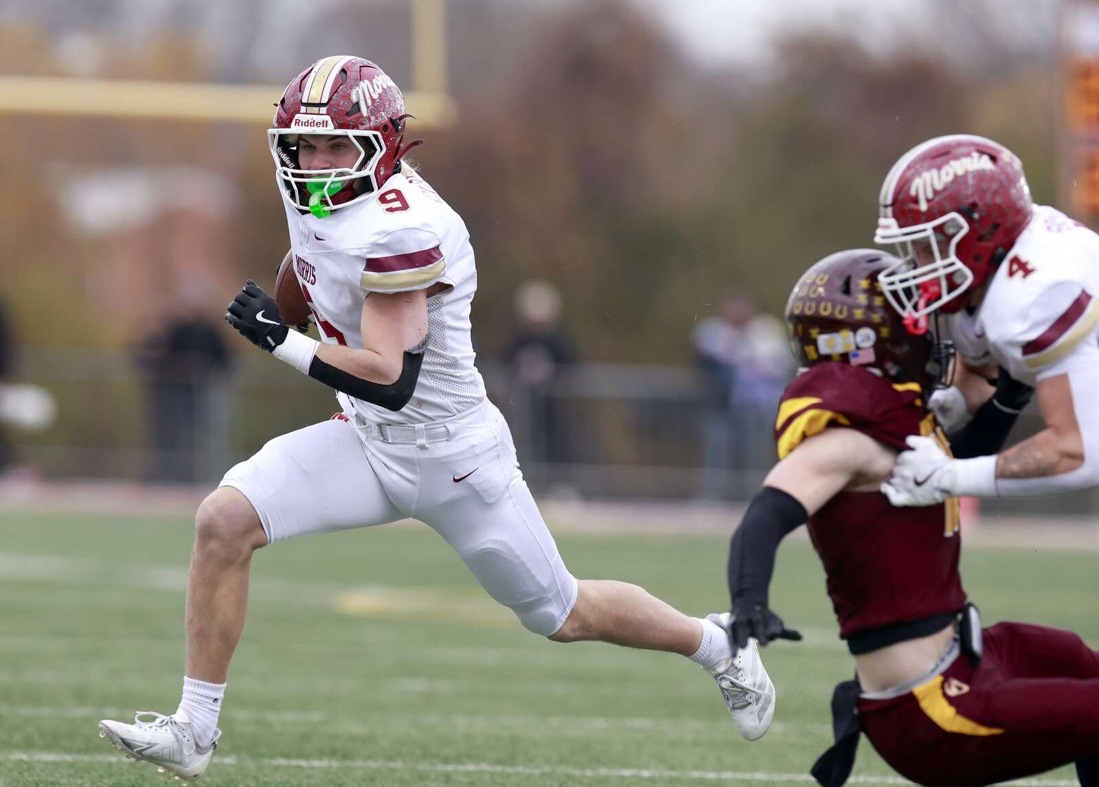 Morris' Caeden Curran (9) moves outside and looks for running room during the IHSA Class 4A semifinals football playoff game Saturday, Nov. 22, 2025 in Lombard.