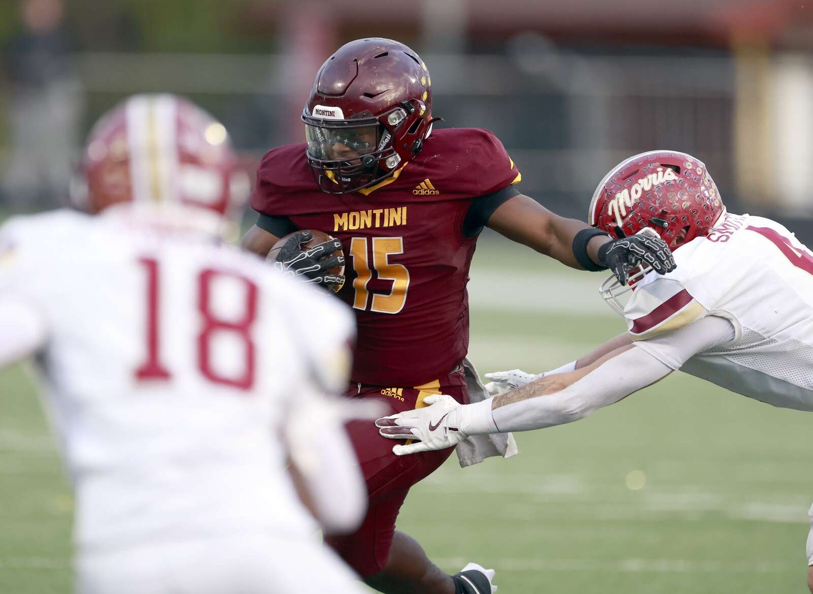 Montini's Charles Flowers (15) looks to slide past Morris' Mick Smith (4) during the IHSA Class 4A semifinals football playoff game Saturday, Nov. 22, 2025 in Lombard.