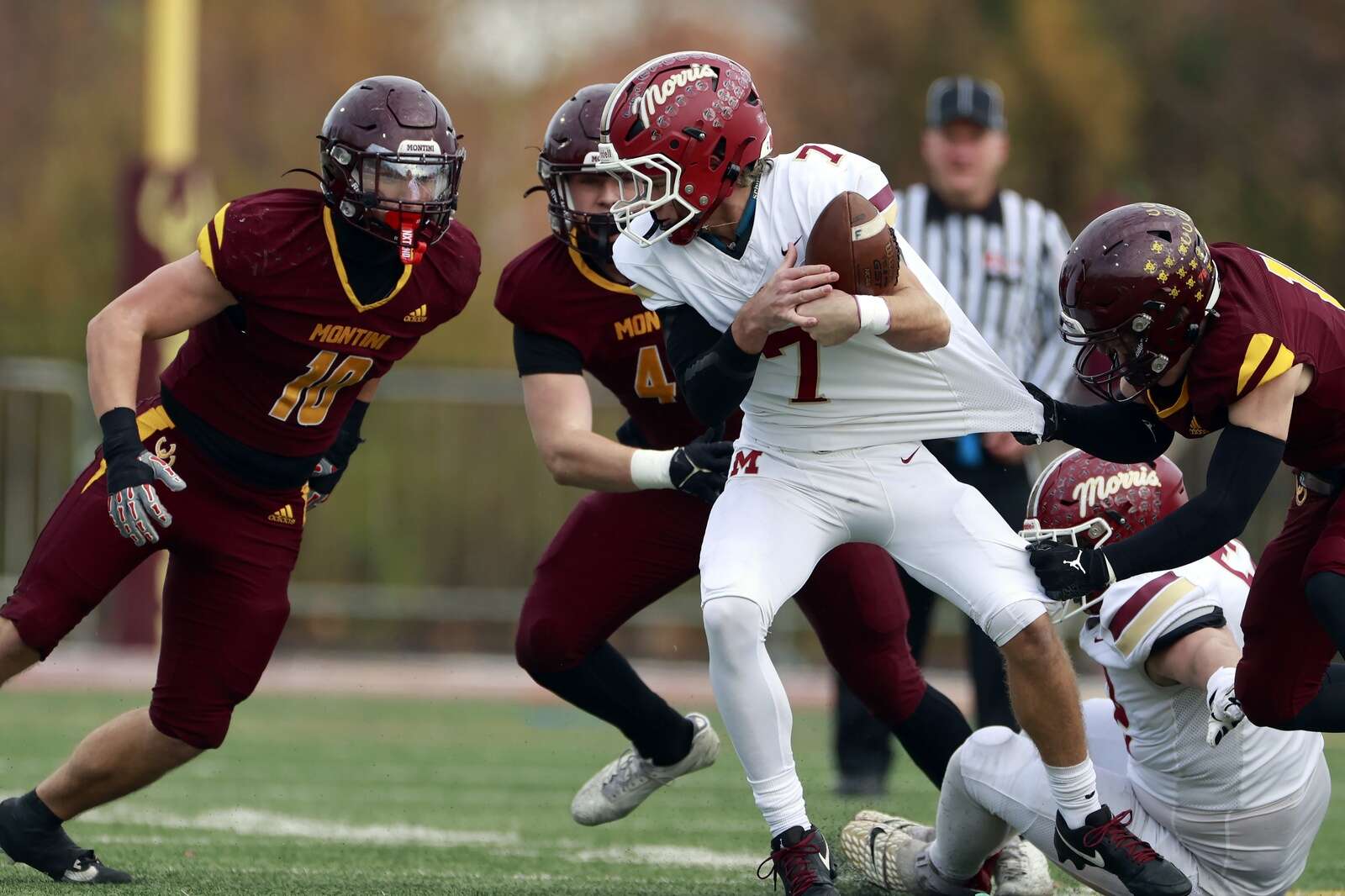 Morris' Logan Conroy (18) looks to evade a host of Montini players during the IHSA Class 4A semifinals football playoff game Saturday, Nov. 22, 2025 in Lombard.