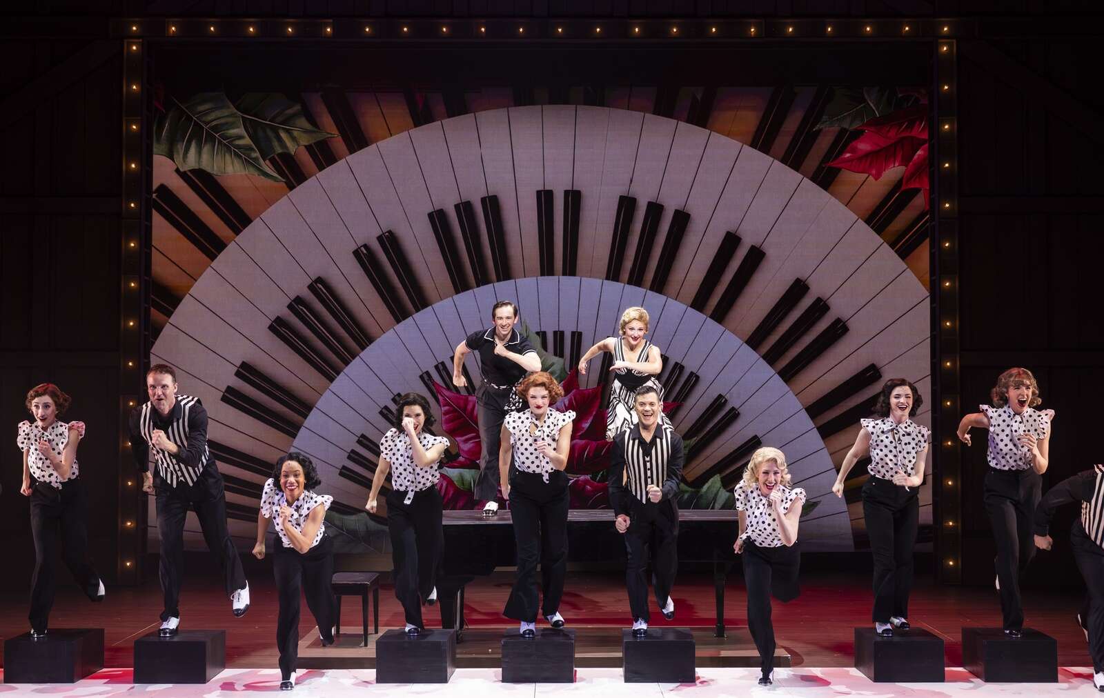 The indefatigable Dolan and Potter also take center stage during Fischer’s tap-tastic “I Love a Piano,” a near show-stopping ragtime tune that unfolds on a giant keyboard and against a swirling backdrop of piano keys courtesy of set and projection designer Jeffrey D. Kmiec. Mara Blumenfeld’s elegant and witty period costumes also deserve kudos.