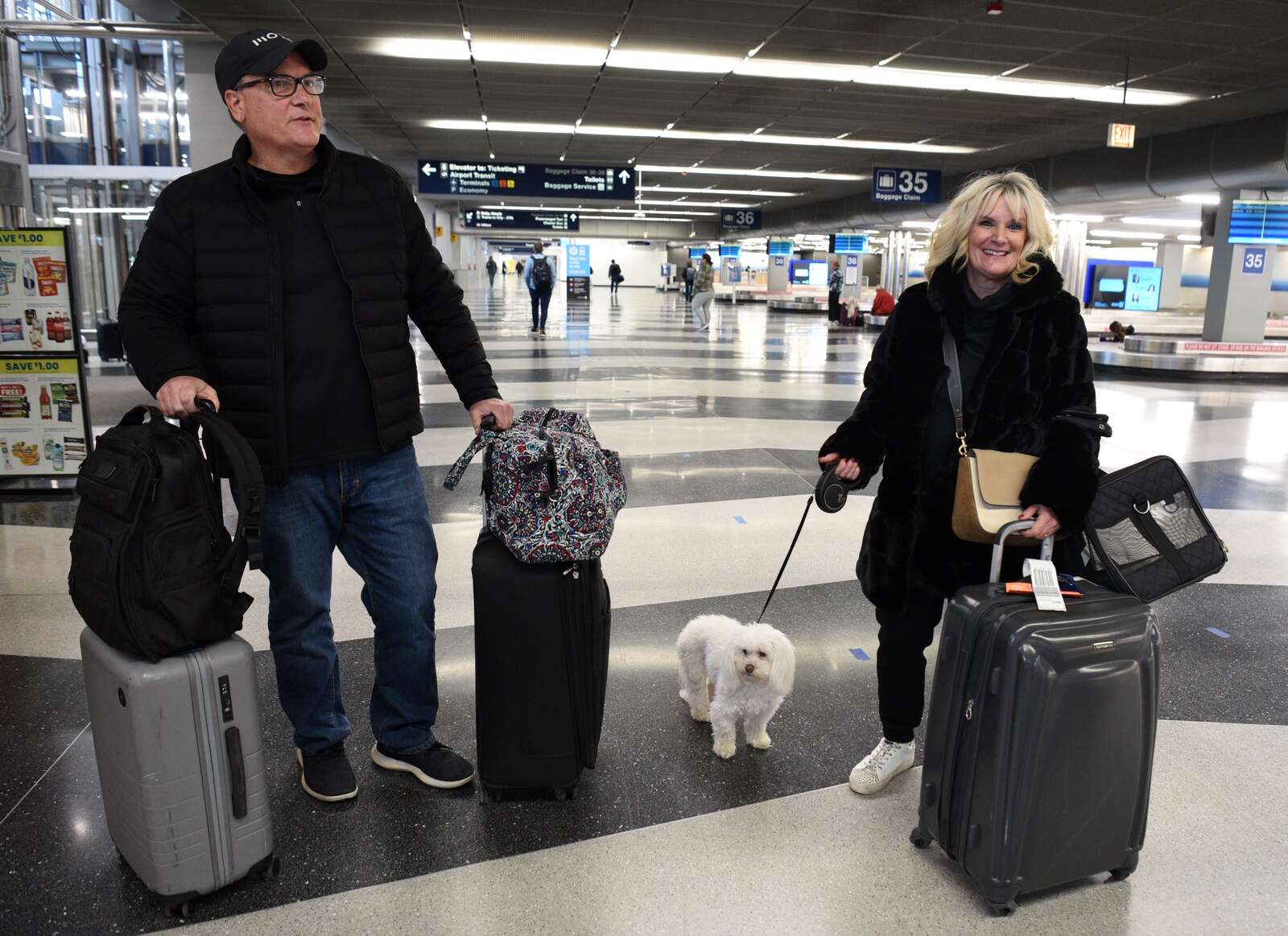 Karen and Michael Browne’s plane landed at O’Hare on time, but it took about 30 minutes to reach a gate. The Rogers, Arkansas, couple rolled with it, as did their dog, Charlotte.