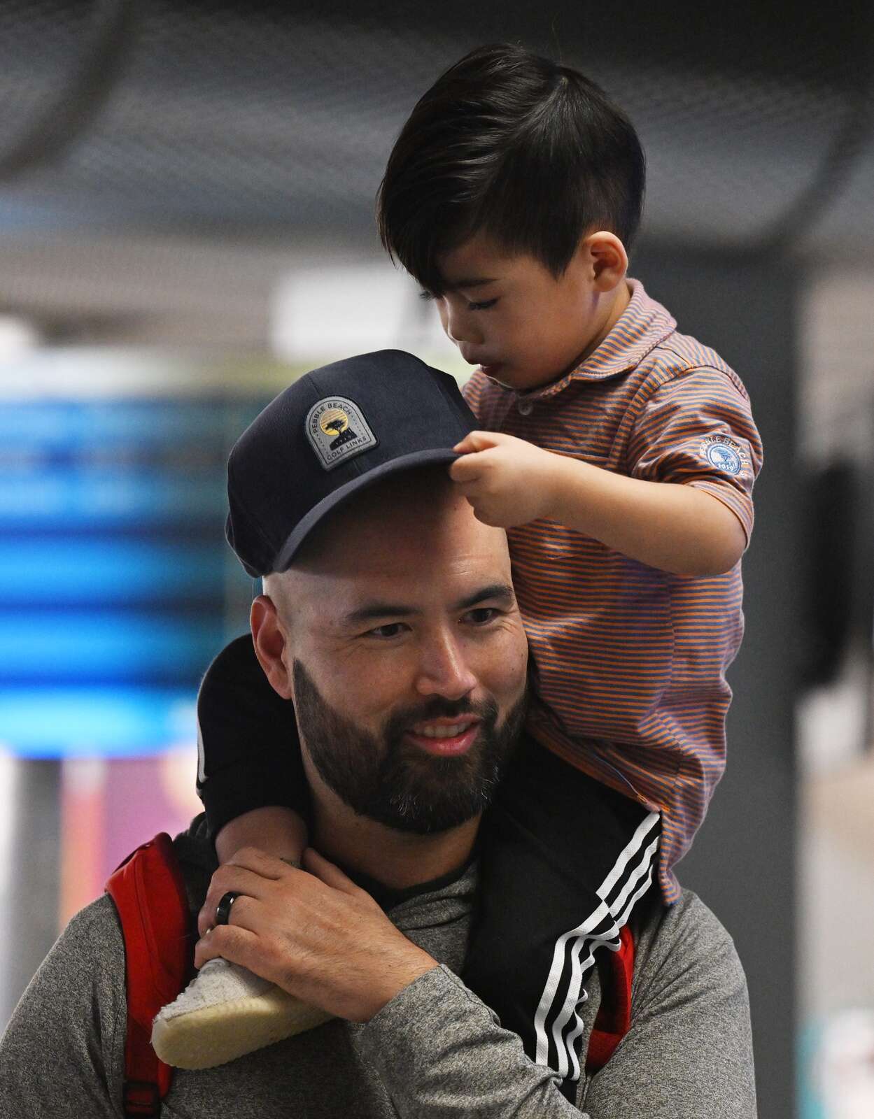 Two-year-old Jaxon Labonte had a bird’s-eye view of the arrivals level atop the shoulders of his dad, Jim.