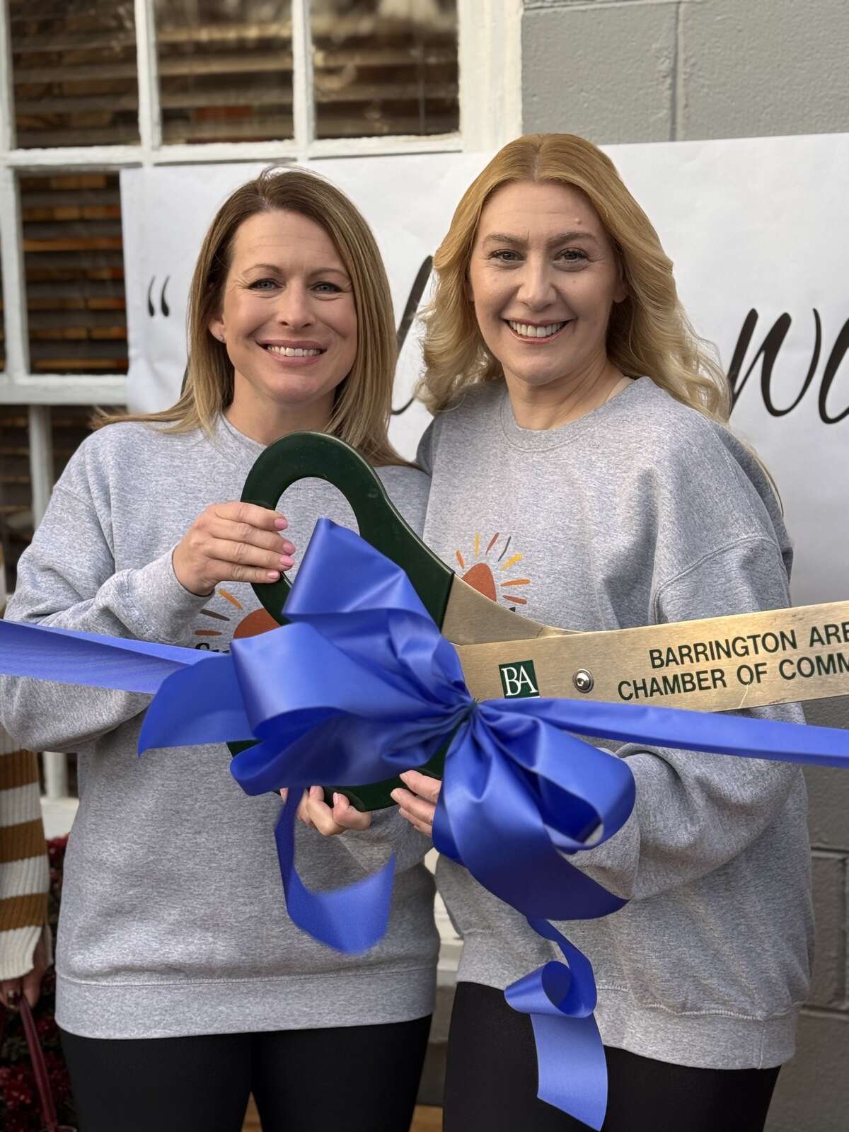 Owner April Cisneros, right, and Certified Rebound Instructor Melissa Hansen cut the ribbon during the grand opening celebration of Sunwellth Pilates at 220 James St. in Barrington on Nov. 11.